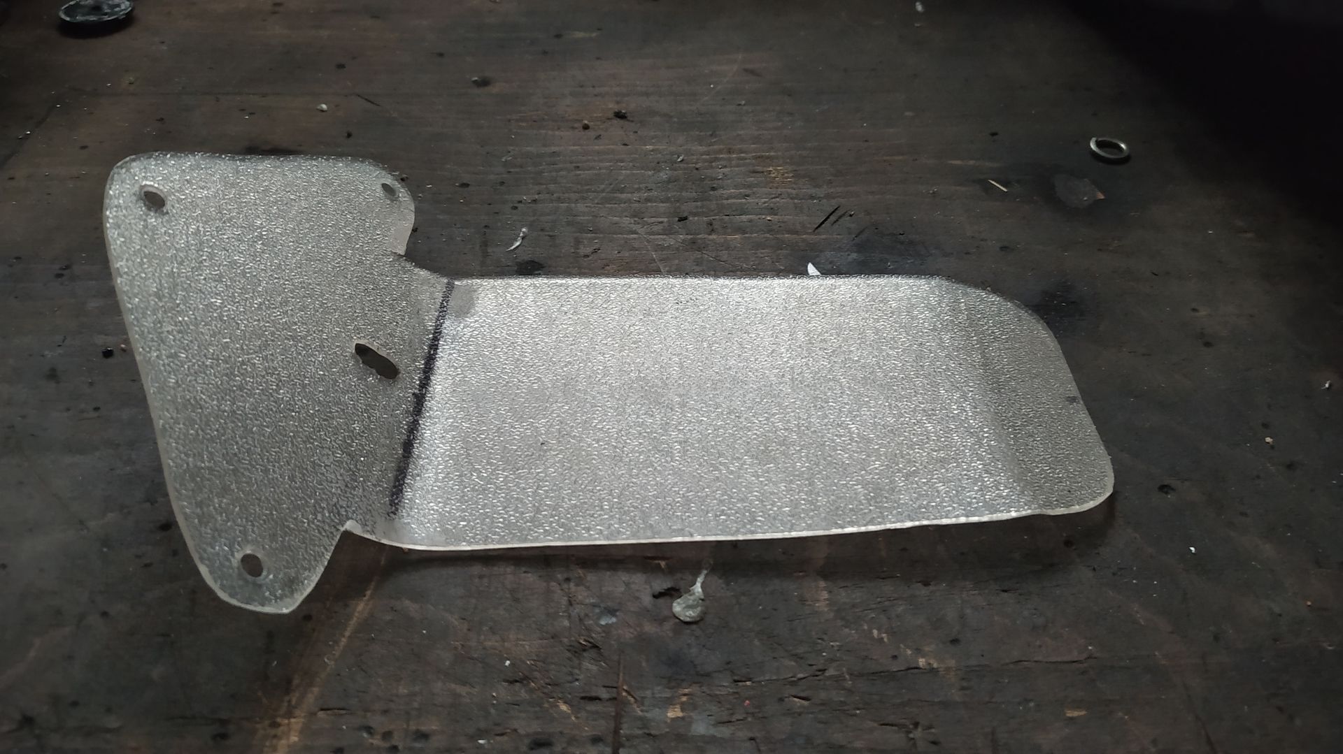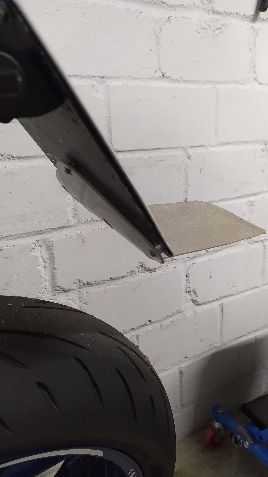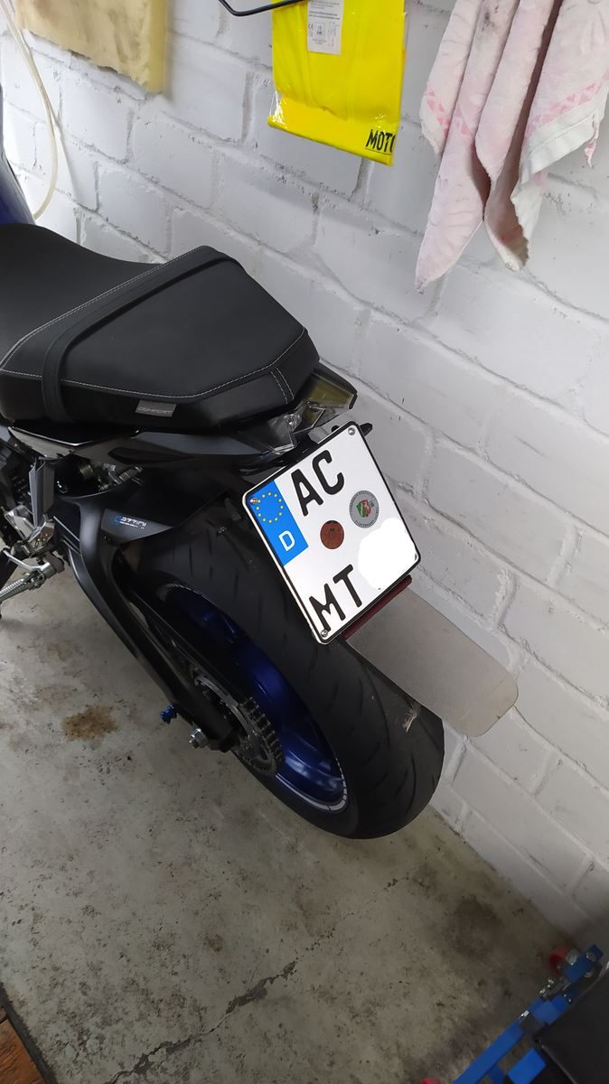 vor meiner Alpentour vor zwei Wochen hatte ich mir auch Gedanken gemacht, wie ich das komplette Einsauen meines Rückens bei einer Regenfahrt vermeiden / verringern könnte. Da ich auf kurzen Kennz.-Halter umgebaut habe und dies für die Tour nicht extra rückgängig machen wollte, musste eine andere Lösung her. Auch wollte ich nicht dauerhaft im Urlaub mit so einem unansehlichen Teil rumfahren....also musste der Spritzschutz schnell montierbar (nämlich dann, wenn's anfängt zu regnen) und auch demontierbar sein . Als Material habe ich ein Stück einer Bürostuhl Unterlage aus Kunsstoff genommen. Zur Befestigung des Teils habe ich die unteren Befestigungsschrauben des Kennzeichens durch längere ersetzt und zusätzlich noch eine Einzelne, etwas höher platziert, in der Mitte verbaut. Das Kunststoffteil habe ich mit einer Stichsäge zurechtgeschnitten und mit Hilfe eines Industrie-Föns in Form gebracht. Rasch noch drei Löcher gebohrt.....feddich. Ich habe mich dazu entschieden, den Schutz waagerecht nach hinten zu "biegen" anstatt der Linie des Kennzeichens nach unten zu folgen. Leider musste ich sowohl auf der Hinfahrt (im Nordschwarzwald) als auch in Italien selber Gebrauch von dem Spritzschutz machen....Nach dem Anlegen der Regenklamotten habe ich dann mittels 3 mitgeführten M6 Schräuchen den Sprizschutz befestigt (dauert ca. 1 Minute)........und tatsächlich.....es funzt. Natürlich nicht zu 100 %........aber so, dass mir nicht die Brühe hinten in den Kragen läuft (ich könnten ja eventuell noch eine, aber längere Version, bauen).