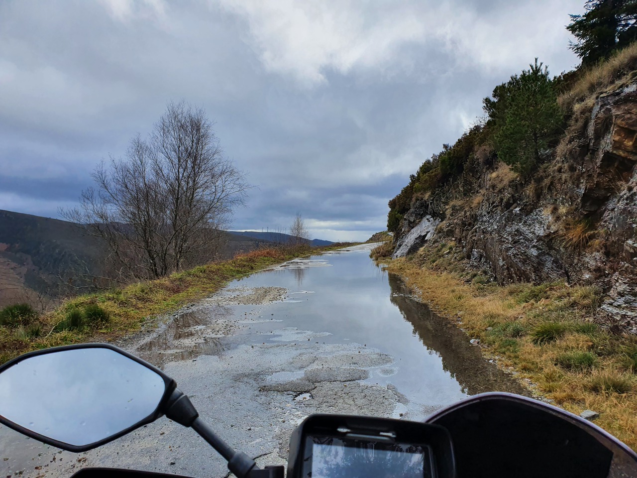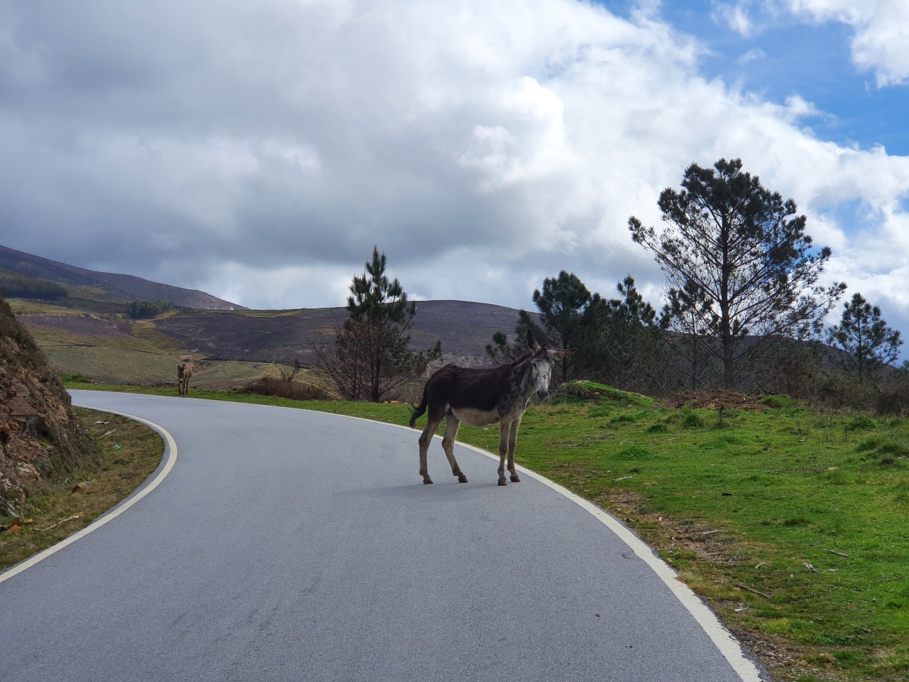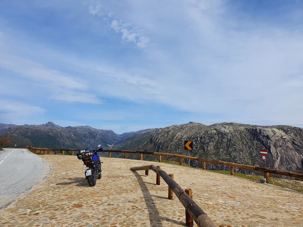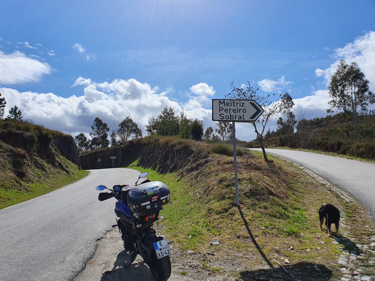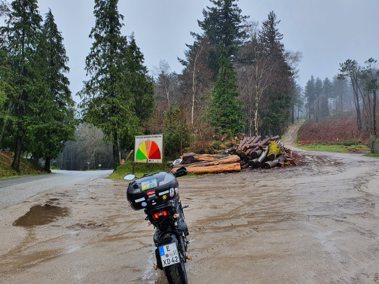 Auf dem Weg zu den letzten beiden Punkten werden die Straßen schlechter. Sie bleiben angenehm breit und die Radien eigenen sich auch für hohes Landstraßentempo, aber die Oberflächenbeschaffenheit lässt es wie eine schlechte Idee erscheinen, hier zu viel zu versuchen. Also gehe ich es gemütlich an. Auf dem Weg zum letzten Punkt kommt mir heute das erste Motorrad entgegen: Ein im Stehen fahrender Endurist. Der Punkt selbst ist eine Sackgasse, und warum, erfahre ich auch gleich: