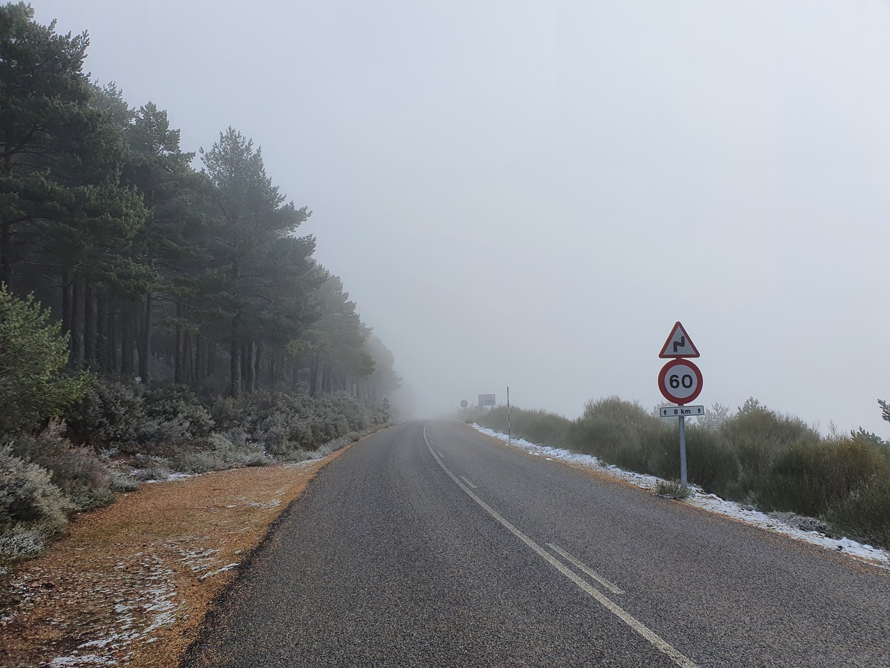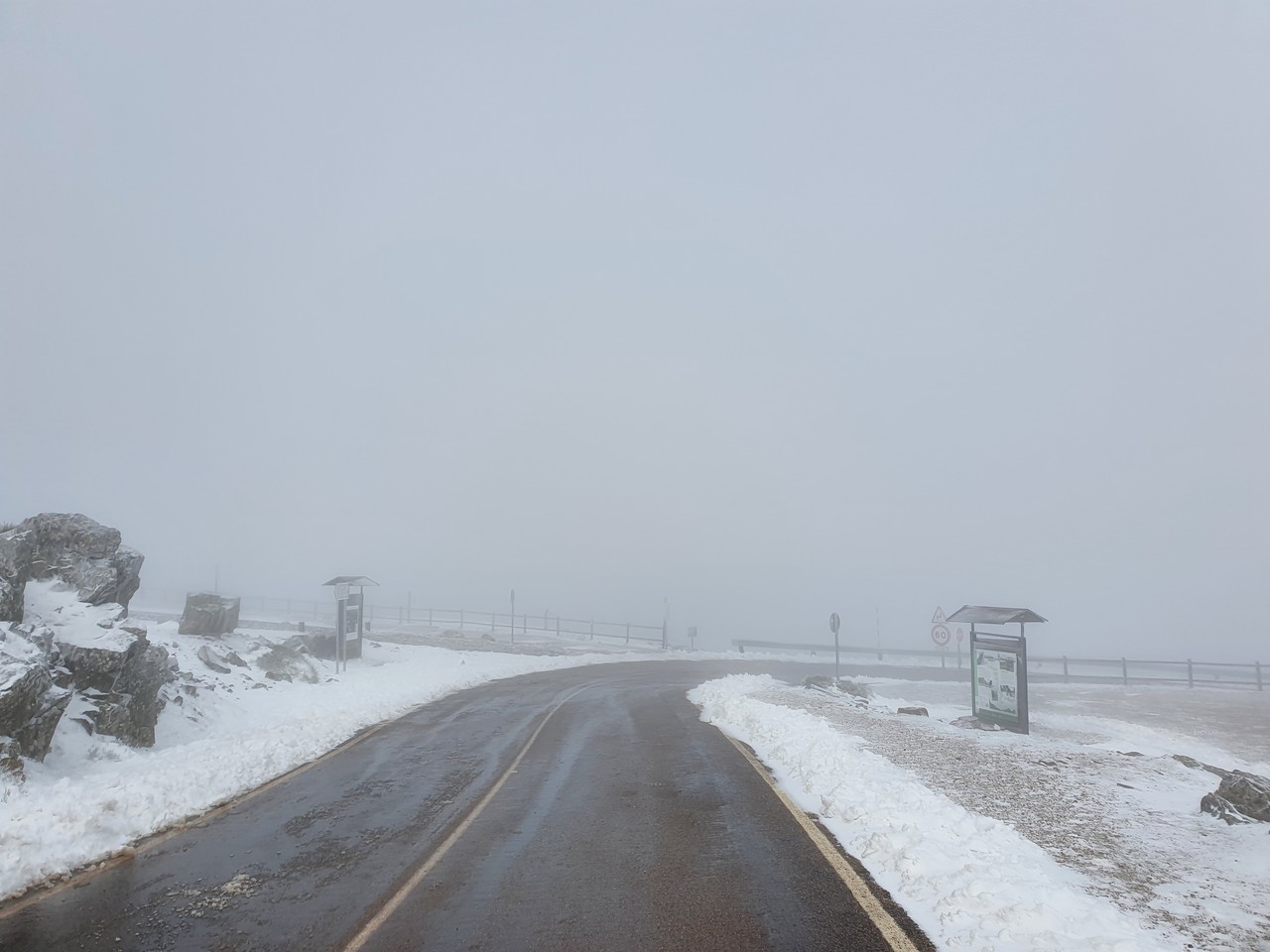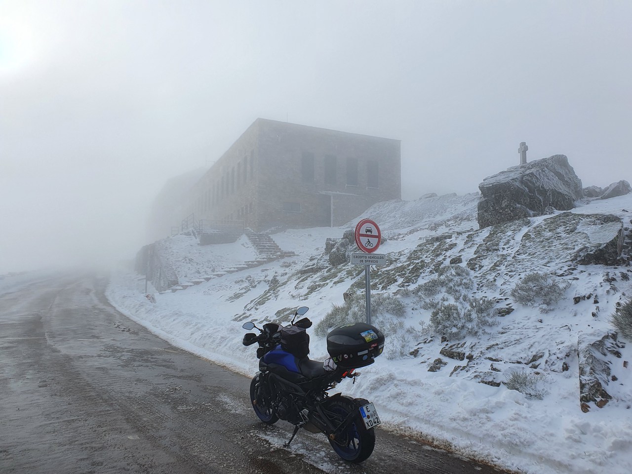 Die Route den Berg hoch bin ich letztes Jahr schon gefahren, aber so recht erinnern kann ich mich nicht. Letztes Jahr war ich hier bei Regen und Nebel. Jetzt ist dagegen richtig warm, also mir zumindest, nach all der Warterei in den warmen Motorradsachen. 7 Lagen am Rumpf, 5 Lagen an den Armen und Beinen und 6 am Bobbes. Das Thermometer zeigt 7 Grad. Es sieht auch eher warm aus, mit erkennbaren Spuren von Kälte vorher: