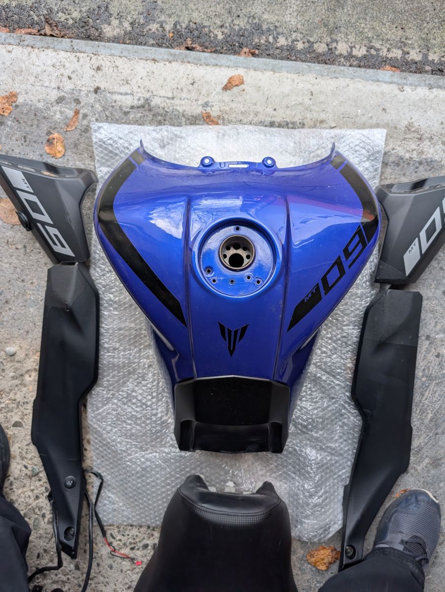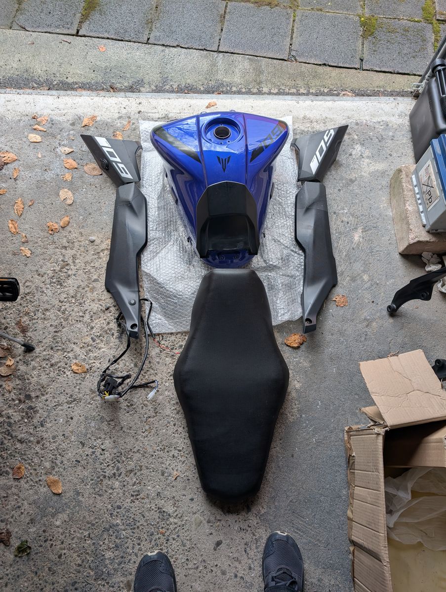 18 Liter-Tank von Tracer 900 adaptiert und in Yamaha-blau professionell lackiert, dazu passende hohe Sitzbank und angepasste Seitenverkleidungen - Unikat, Handarbeit, funktioniert Plug & Play mit gleichem Tankschloss und Benzinpumpe, auch geeignet um eine Tracer nach Naked umzubauen, 500.-
