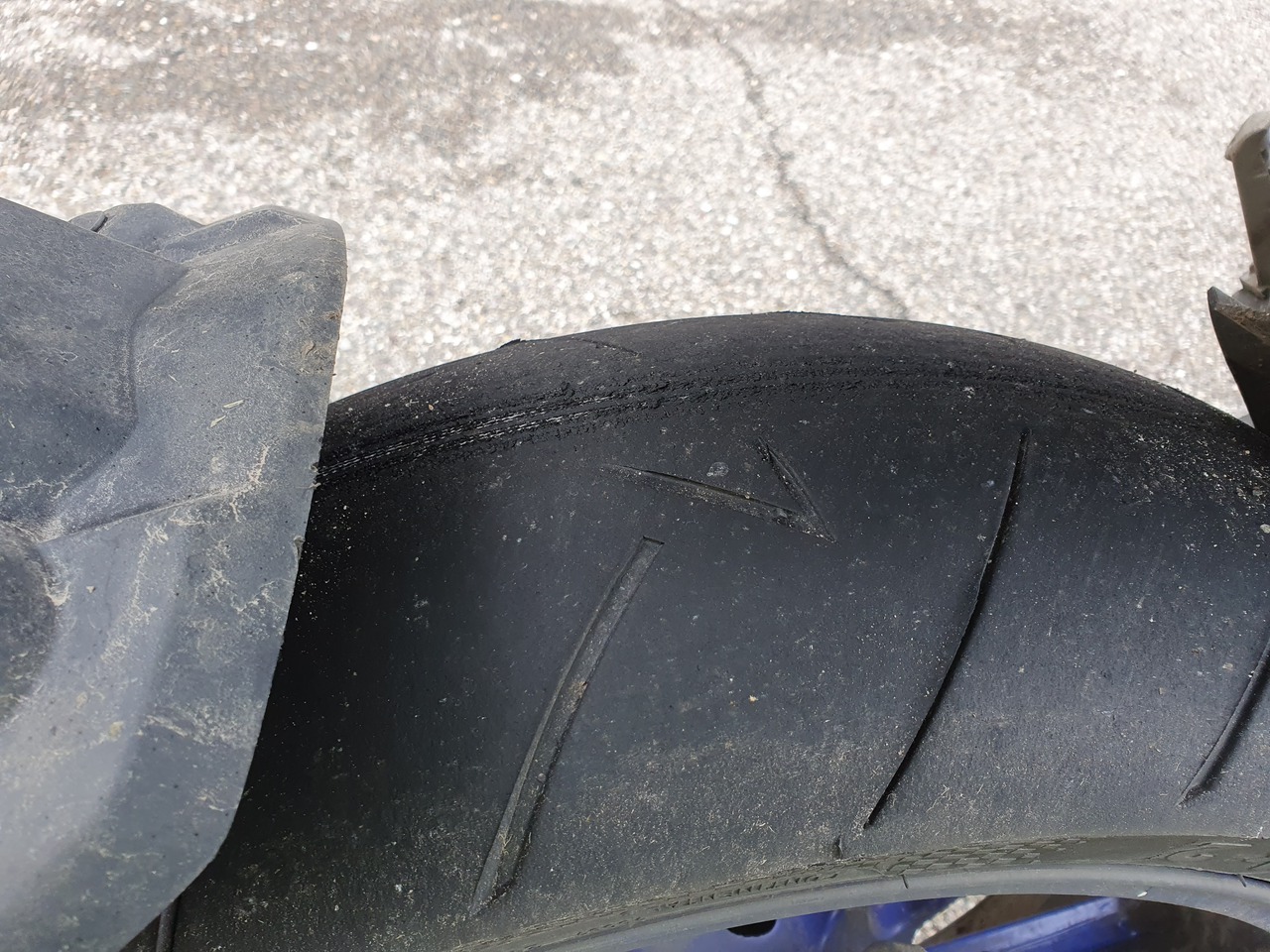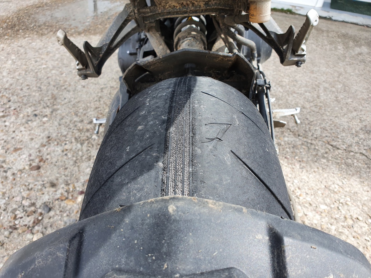 Im nächsten Dorf mit sicherem Handynetz gucke ich was die Route so an Reifenhändlern kennt. In 70 km Entfernung sind zwei. Das müsste doch recht sicher gehen. Danach wäre die Autobahnauffahrt, für den Plan mit dem Anhalter. Ich habe aber leider keinen Minirock im Gepäck. So eiere ich behutsam zum Euromaster in Aranda de Duero, und rödle mal komplett ab, um einen guten Eindruck zu machen. Der Reifen sieht jetzt so aus. Eindeutig negative Profiltiefe.