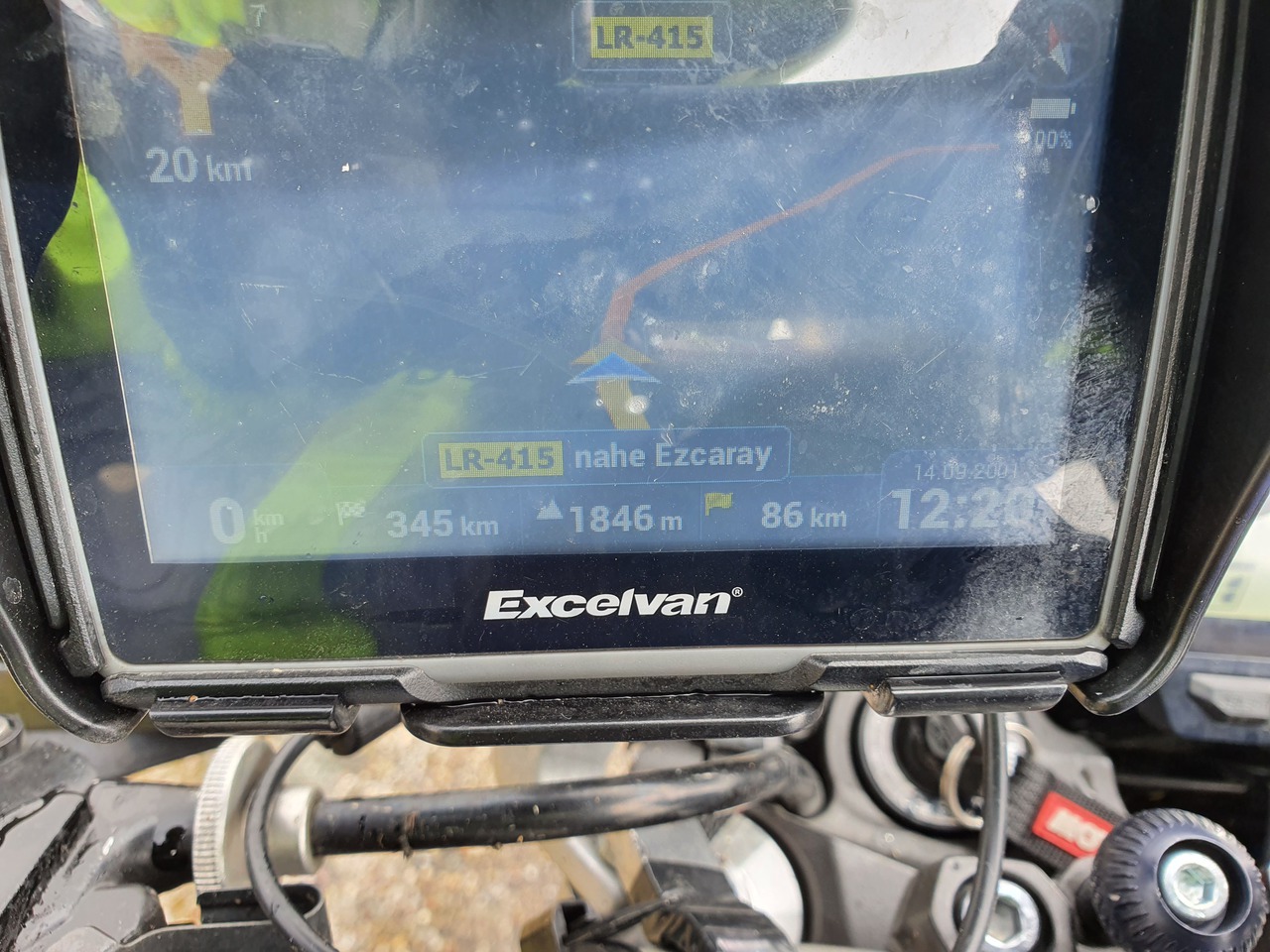 Was sagt die Tankstellenplanung? Wat? Da kommen 150 km keine Tankstellen mehr?? Dann tanken wir mal vorher. Dabei einen Blick auf die Reifen werfen: ja, sind beide noch da. Luftdruck habe ich im Cockpit immer im Blick. Der hintere wird langsam eckig und zeigt ein Profil in der Mitte, das er gestern noch nicht hatte. Das ist nicht gut, aber die restlichen 400 km heute wird er ja wohl noch halten. Mit frischem Schwung geht's wieder auf die Piste. Am Passknackerpunkt angekommen wird mir auch klar, warum da 150 km keine Tankstellen kommen: Weil meine Route eine 75 km lange Sackgasse ist. Es geht 38 km zum nächsten Punkt und dann wieder zurück. Ich nehme mir vorher, an diesem Punkt mal zu gucken, ob das wirklich nicht anders geht. Allerdings kann ich mir das wohl sparen, denn ich komme an mehreren neongelben Schildern vorbei, wo groß und auch in Englisch und Russisch "Sackgasse" drauf steht. Die Strecke wird sehr einsam und schlängelt sich die Berge hoch. Zeit für eine Pause. Schöne Aussicht.