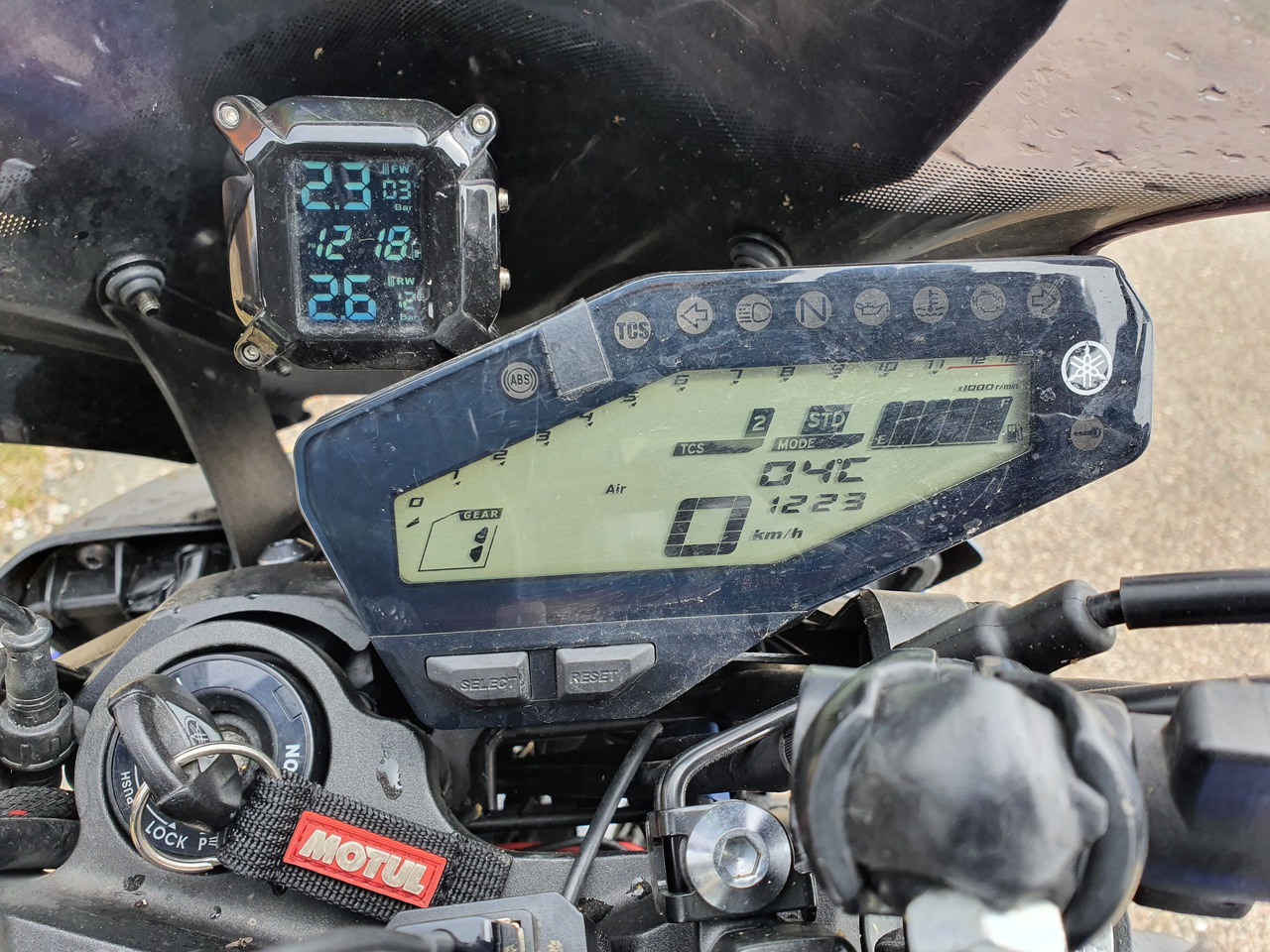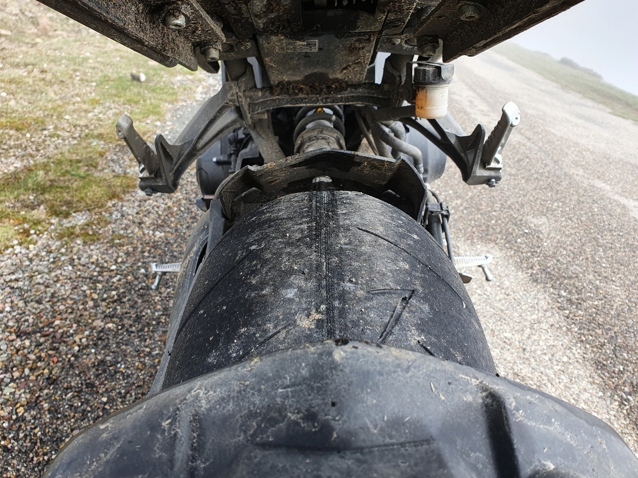Da guckt ja schon Gewebe raus! Wie schnell hat der ContiRoadAttack 2 denn jetzt bitte abgebaut, der ist doch gerade mal 3800 km alt? Und was mache ich jetzt? Ich hätte noch 400 km bis zum Yamaha-Händler. 50 km kann ich kürzen, den Passknackerpunkt hole ich beim nächsten Spanienbesuch. Aber auch 350 km sind ehrgeizig bis gefährlich mit so einem Reifen. Und vor allem, breche ich hier ab, oder fahre ich noch hoch die 20 km zum Punkt und 20 km wieder runter - wo garantiert niemand vorbei kommt, Handyempfang fraglich ist, und es kalt und neblig ist?