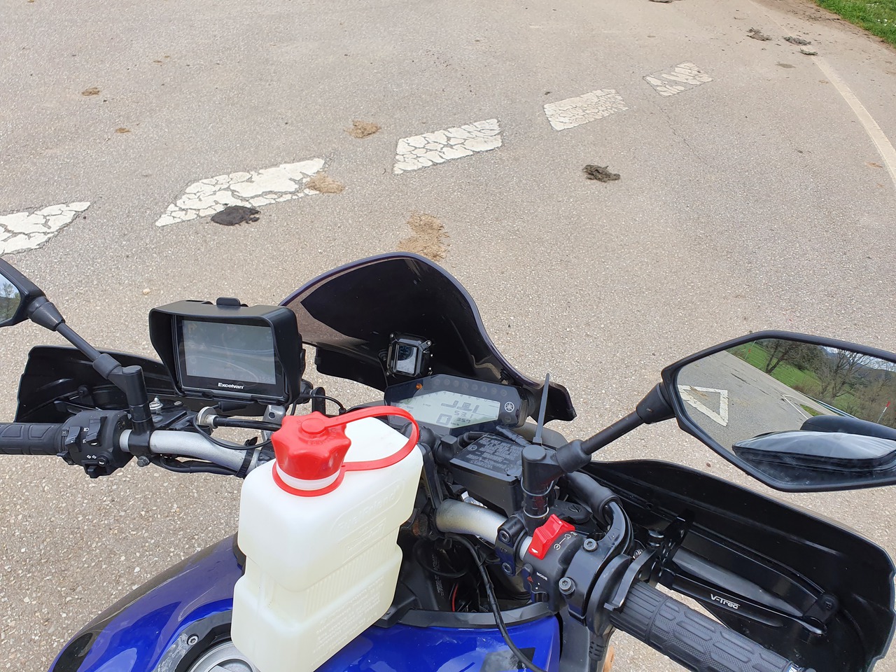 Danach kommt wieder eine lange Überführung und wie schon erwartet verlassen mich die Kräfte, denn leider geht während der letzten Stunde der Regen erst richtig los, und neben den Handschuhen wird auch die Hose undicht, trotz Regenkombi. Dabei hat es auch nur noch 8°C und mir ist schon lange echt kalt. Wäre der Tracer-Tank-Umbau vor der Reise gelungen, hätte ich jetzt auch Sitzheizung. Aber das nur am Rande. Beim letzten Tankstopp suche mir also ein Hotel mit Restaurant, und werde für 28 Euro fündig, wenn auch 20 km abseits der Route. In den Bewertungen ist von sicherem Motorradparkplatz die Rede.