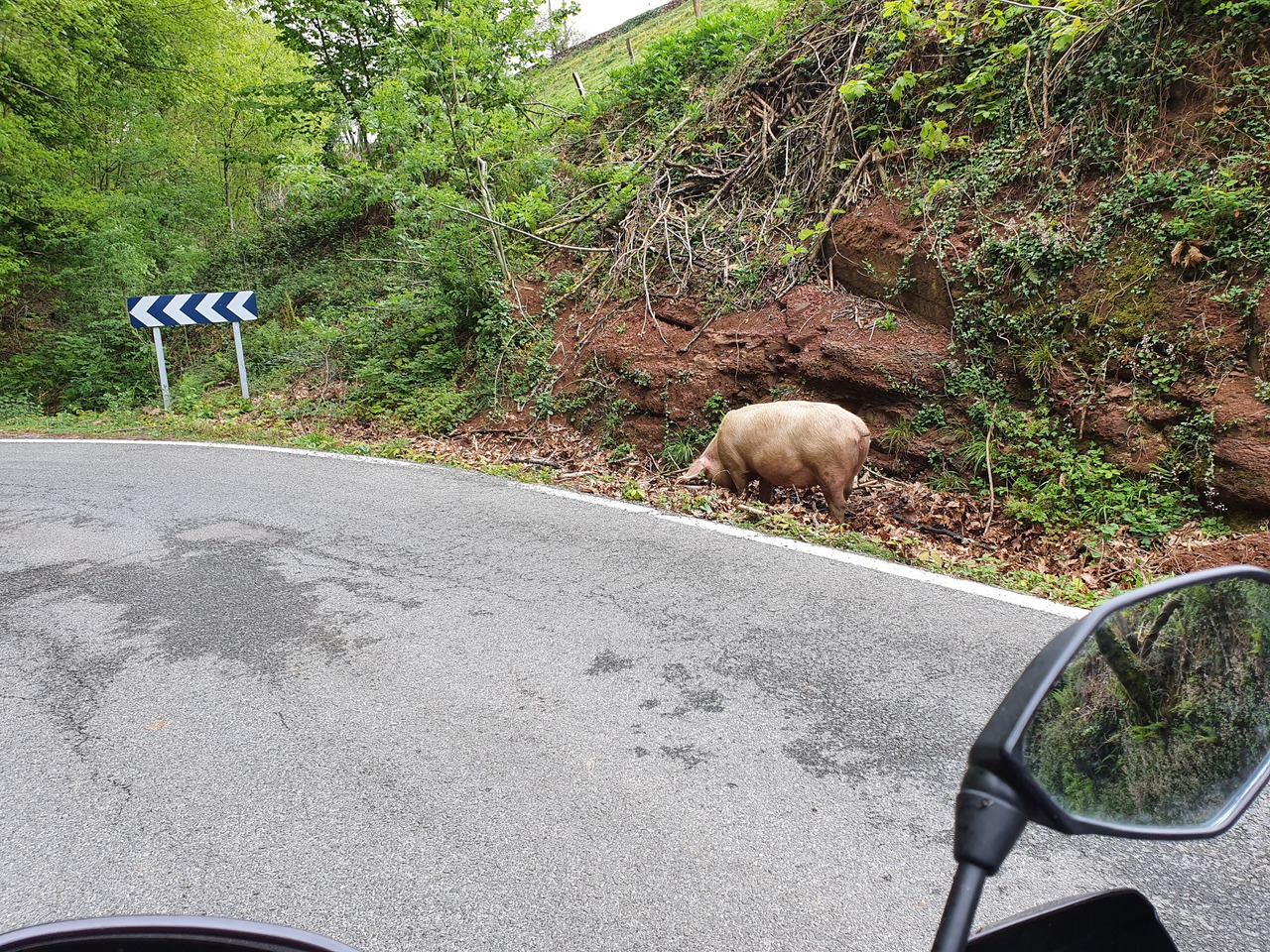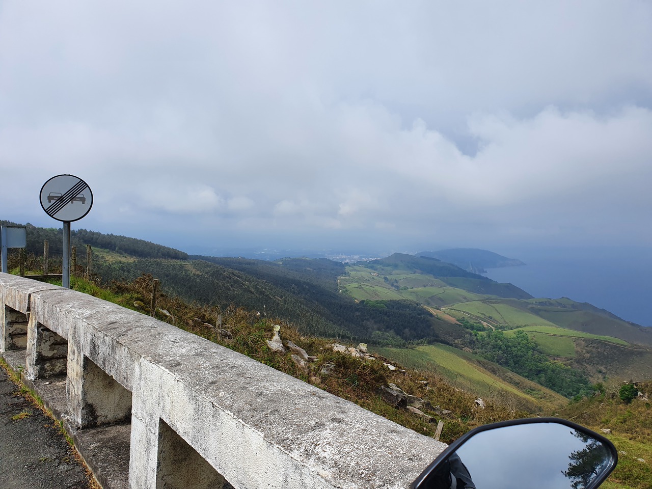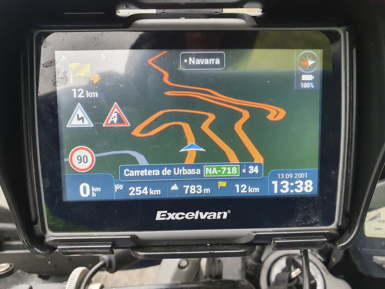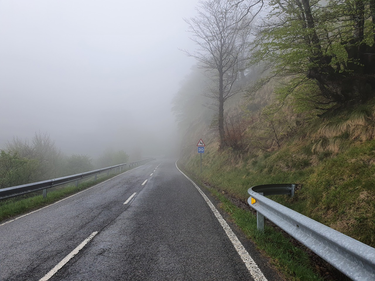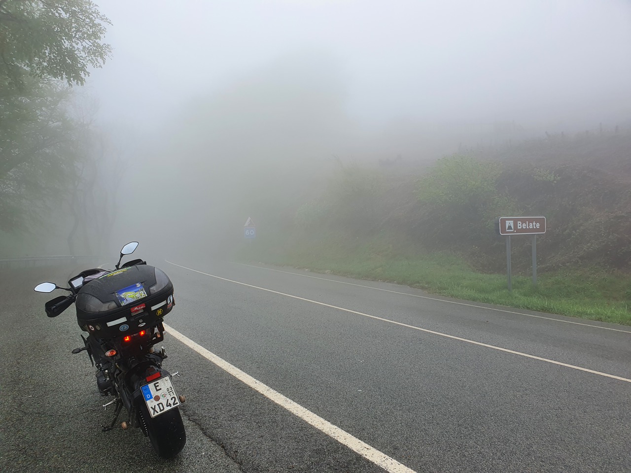 Den ganzen Tag? Nein, nur auf den Pässen. Im Tal geht's, also in Pamplona. Mein Test-Termin ist gebucht und bezahlt, satte 95 Euro, da will man pünktlich sein. Es gibt natürlich sinnvollere Aktivitäten als im Nebel auf nassen Passstraßen an Ende der Welt unter Zeitdruck Motorrad zu fahren, aber es passt zufällig ganz gut. Auf der Autobahn könnte ich noch Zeit aufholen, denke ich mir so, und drehe am Quirl. Dabei überhole ich zwei PKW der Feuerwehr, und denke mir nichts dabei. Ein paar Minuten später kommt ein Tunnel, da mache ich lieber langsam. Am Ende des Tunnels überholt mich der vordere Feuerwehr-PKW, bremst, und setzt sich vor mich. Und macht das Blaulicht an.