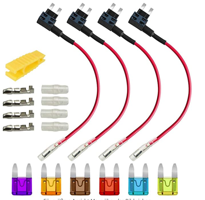 Die werden anstelle der Originalsicherung eingesteckt. Dann wird die Originalsicherung draufgesteckt und eine zusätzliche Sicherung für den Abzweig. Am roten Kabel hat man dann abgesichertes Plus. Wenn man sich 'ne Sicherung mit Zündplus sucht, hat man abgesichertes Zündplus.