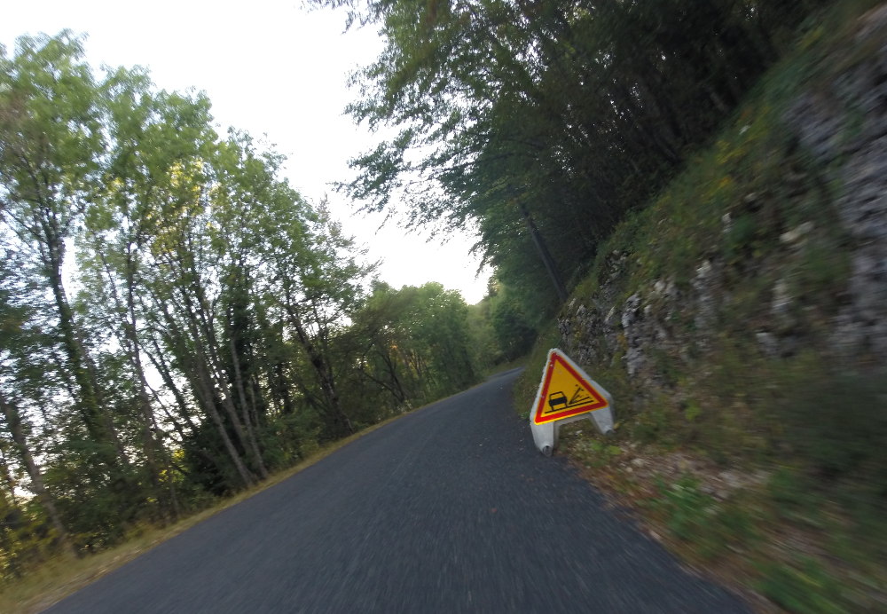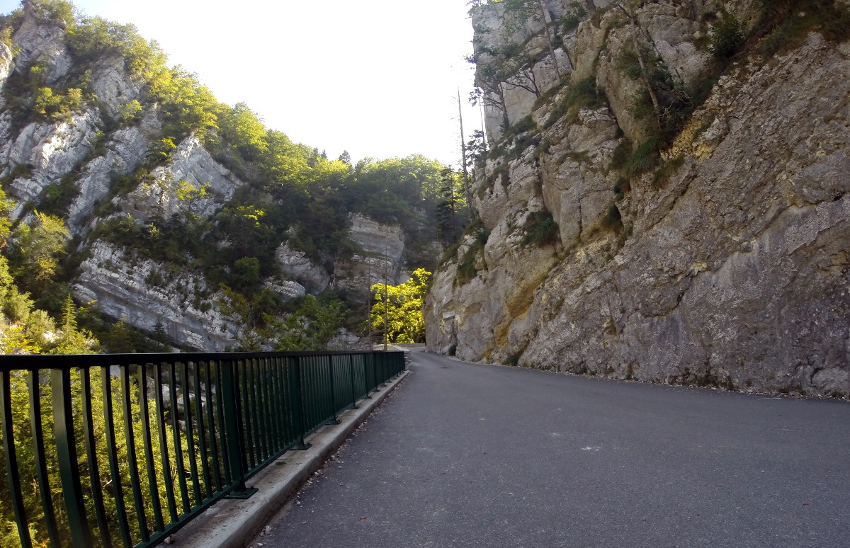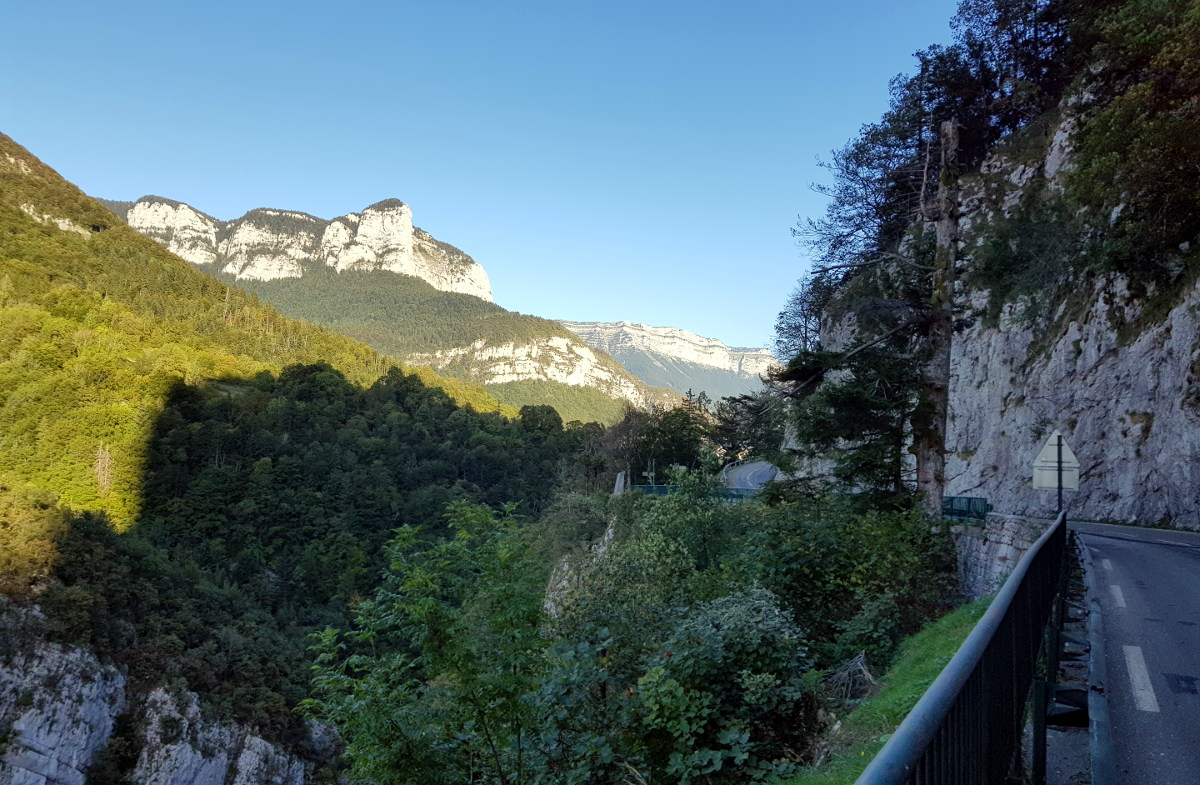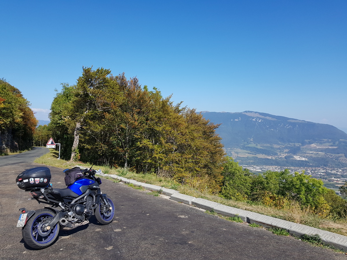 Durch das dicht besiedelte Tal Isère-Tal kommen wir ohne große Umstände, und dann schwingen wir uns ins Chartreuse-Gebirge ein. Leider werden wir öfters von Schotter auf der Strecke ausgebremst – Gravillons! Das zerrt an Laune und Durchschnittstempo. Am Osthang kommt noch reichlich Touristenverkehr dazu (Gleitschirmflieger usw.), was den Effekt verstärkt. Dafür entschädigen die Aussichten teilweise. Markus sieht glücklich aus.