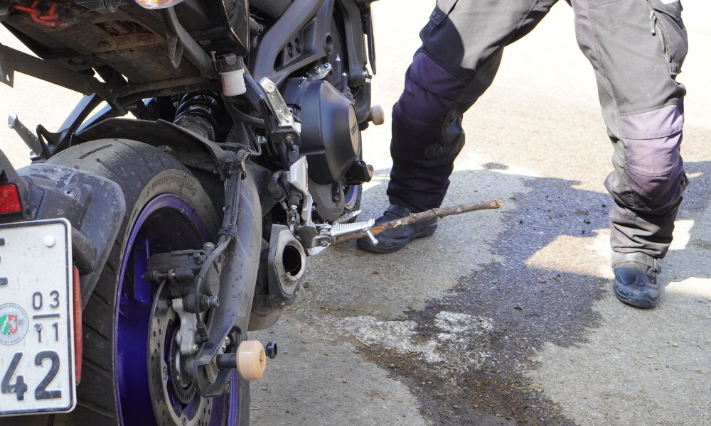 Fucking Gravillon! Das kostet Fahrzspaß und Zeit und frisst dabei noch Reifen – total unfair! Irgendwann unterwegs weiße ich Markus auf einen "Ast" an seinem Motorrad hin. Okay, es war ein langer Strohhalm, aber das Wort fiel mir gerade nicht ein. 10 Minuten später steht Markus kichernd neben mir an der Kreuzung und weißt mich auf einen "Ast" an meinem Motorrad hin. Ich gucke und staune nicht schlecht.