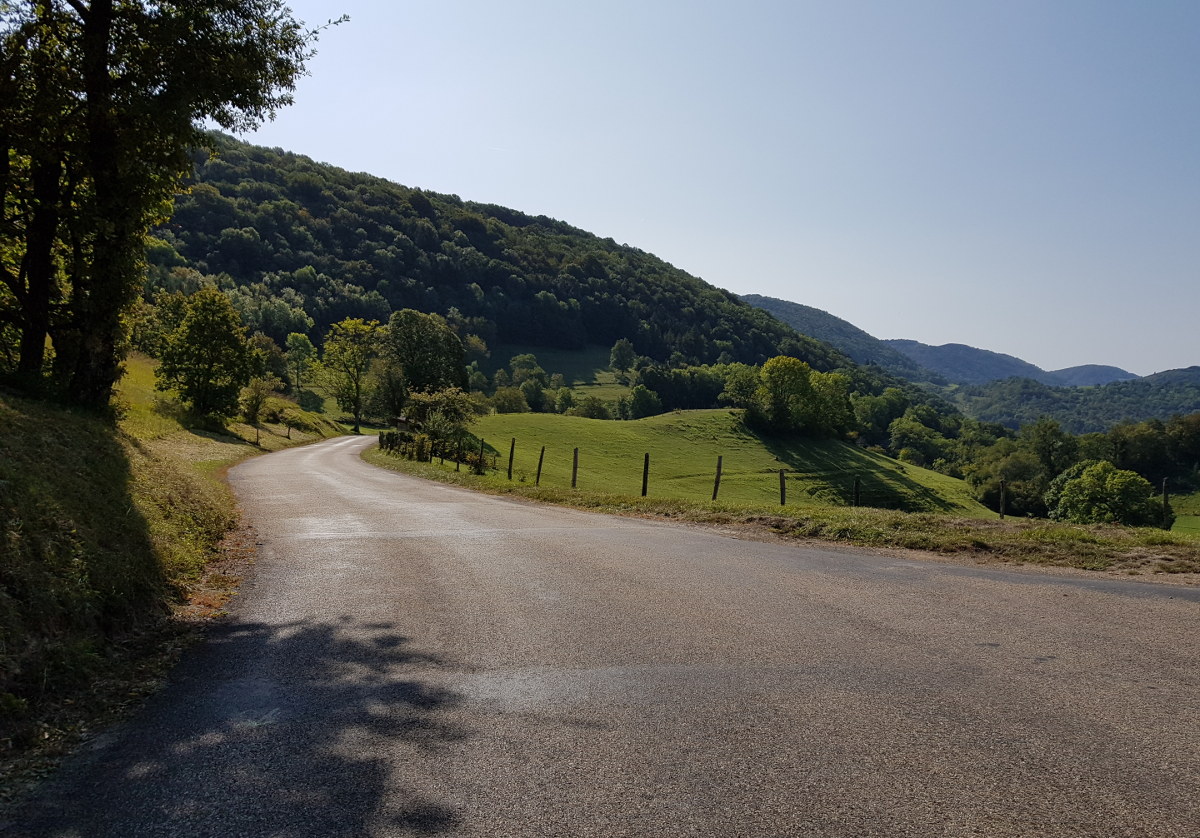 Wir haben ein Appartement in Gex, unten im Tal. Die Strecke runter ist nett und macht Laune.