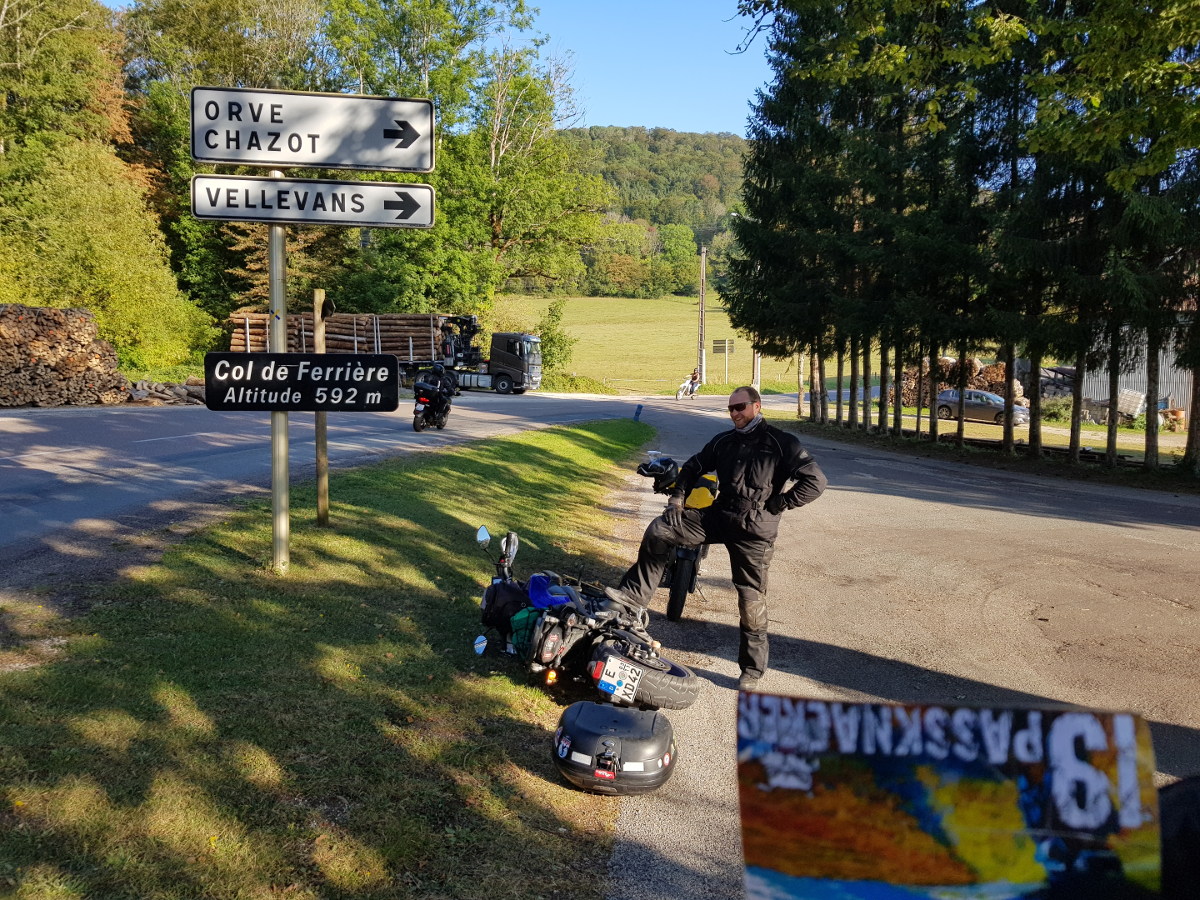 Ich habe noch zwei Passknackerpunkte heute: Col du Pas de Boeuf („Pass vom Pass des Rindes“ oder „Pass vom kein Rind“???), als Abstecher in sehr schlechtem Zustand, und den Col de Ferrière knapp vor einer großen Kreuzung. Da wir hierher recht zügig gefahren sind, will ich beim Fotografieren den Motor laufen lassen, und das klappt nur im Leerlauf. Leider entscheidet sich das Motorrad, dass es doch steil genug bergab steht, um über den Seitenständer nach vorne zu rollen, und es fällt um – dieses Mal aber zur Abwechslung nach links.