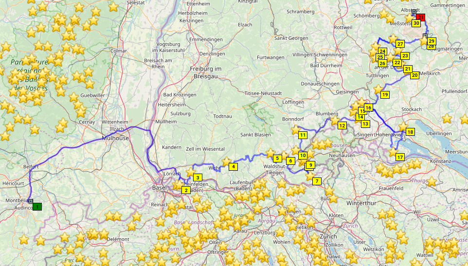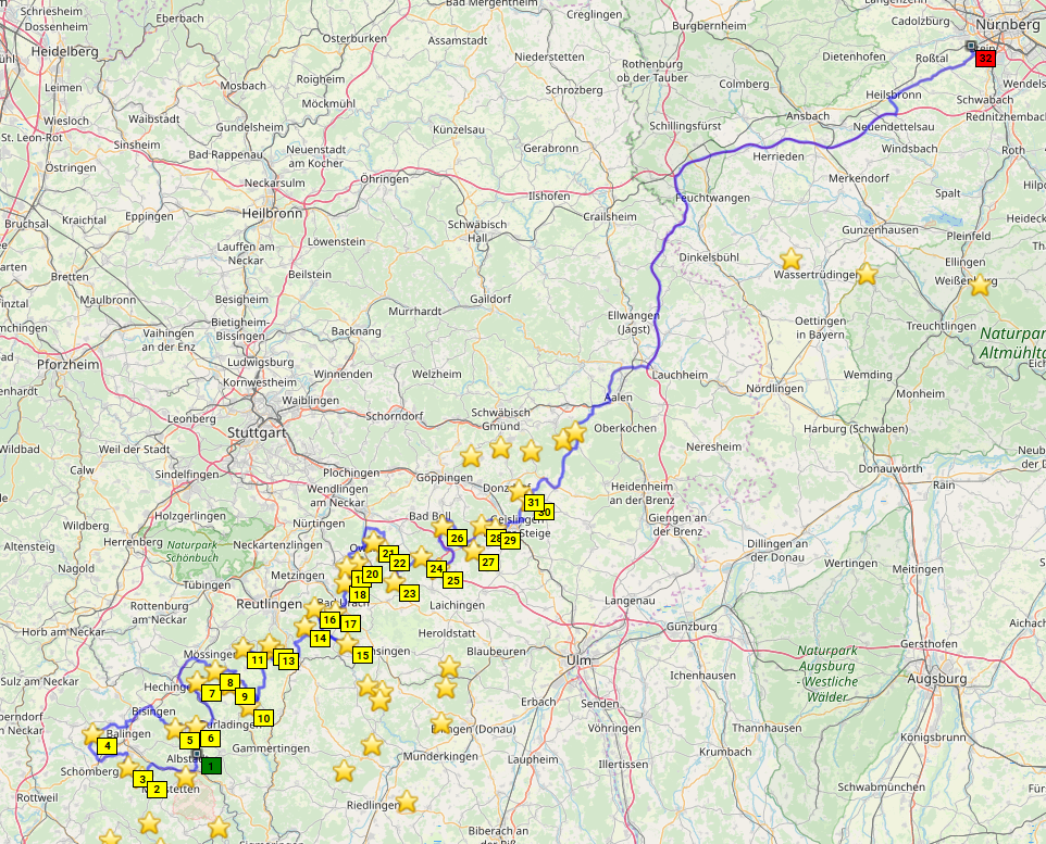 Damit wäre ich wieder alleine unterwegs. Das Thema heute ist mal wieder "Alle Passknacker Deutschlands in 2019". Extra für diesen Reiseteil habe ich mir einige Punkte offengelassen, und zwar die Punkte an der Grenze von BaWü zur Schweiz, die man auf einer einigermaßen geraden Linie befahren kann. So geht es bis zum Bodensee, und dann nordöstlich die Schwäbische Alb entlang Richtung Nürnberg. Überraschend entdecke ich noch 2 fehlende deutsche Passknackerpunkte am Westende des Bodensees, die aus irgendeinem Grund nicht Teil meiner ursprünglichen Planung waren. Das wäre sehr blöd gewesen, wenn die am Ende der Tour noch offen gewesen wären. Gut, dass wir verglichen haben! Die Route sieht so aus.