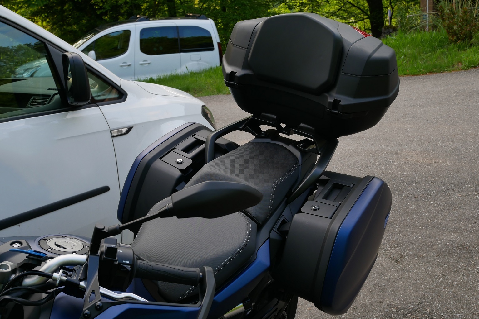 für längere Reisen zu zweit sind mir die Originalkoffer 20L auch zu wenig. Nach reiflicher Überlegung entschied ich mich dann doch für ein Topcase (50L) von Yamaha. Bietet nun genug Raum für Gepäck und ist auch noch bequem für die Beifahrerin. siehe Bilder