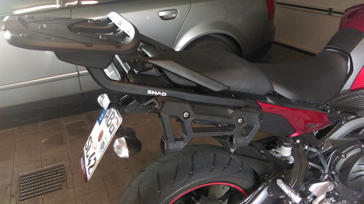 Später kam dann ein Shad-Topcase dazu, die mitgelieferte Halterung kann ohne zusätzliche Bohrungen auf der Platte montiert werden,