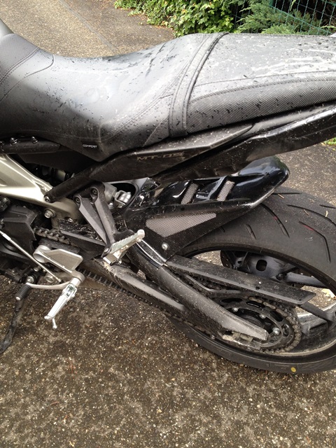 Also, hab vorhin mal ne kleine Runde gedreht und bin, wie´s das Schicksal will, in Regen reingekommen. Nur 15 Minuten Regenfahrt, und siehe da - meine neue Hinterradabdeckung in Carbonoptik (die längste die ich im Netz gefunden hab!) - wie Ihr auf den Fotos sehen könnt; sie bringt gar nichts. Ich muss zugeben, an die Optik hab ich mich schon gewöhnt, gefällt mir sogar inzwischen richtig gut, wer das Teil aber wegen verbessertem Spritzschutz in Erwägung zieht - "leave it". Die 160,-€ lassen sich mit Sicherheit an anderer Stelle besser investieren!