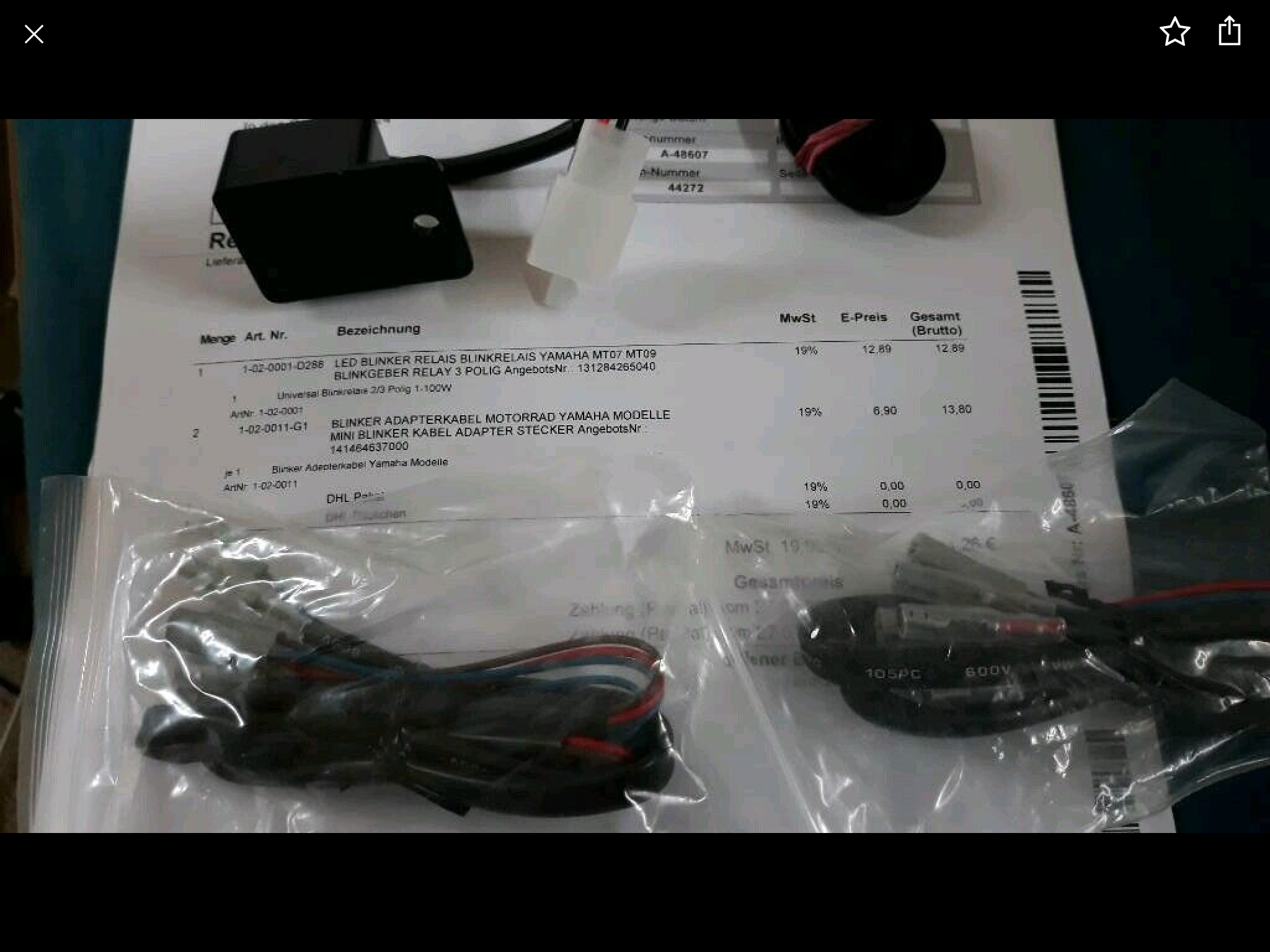 ....hier Bilder von den Blinkern, den Adapterkabeln, dem LED Blinkrelais und den Abdeckblättchen....