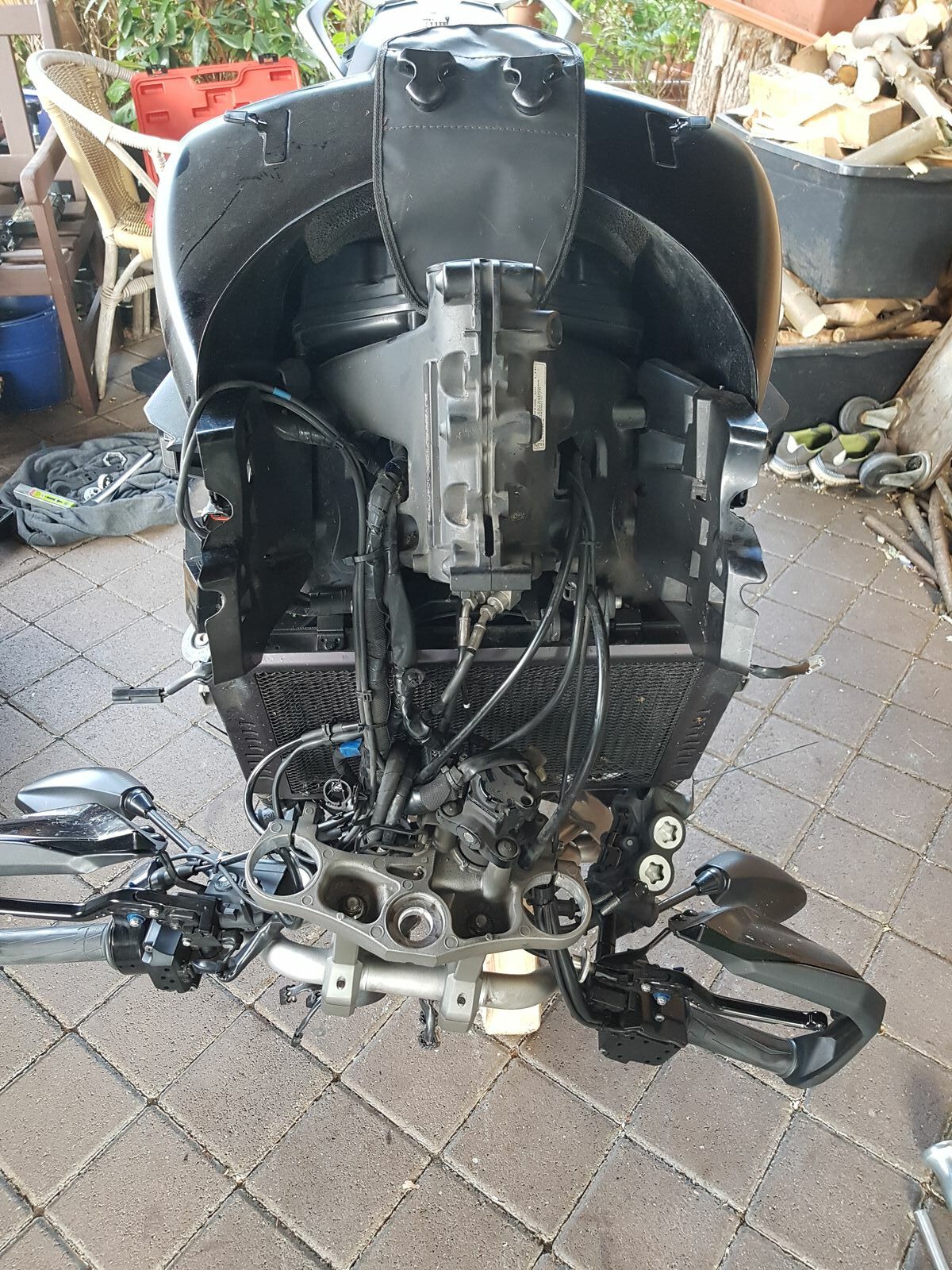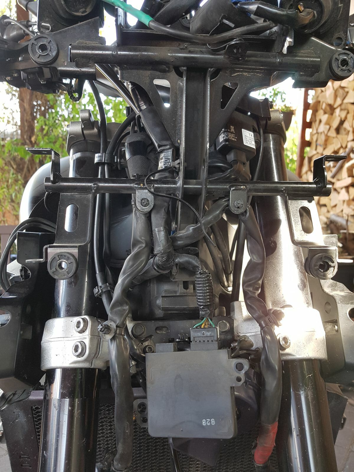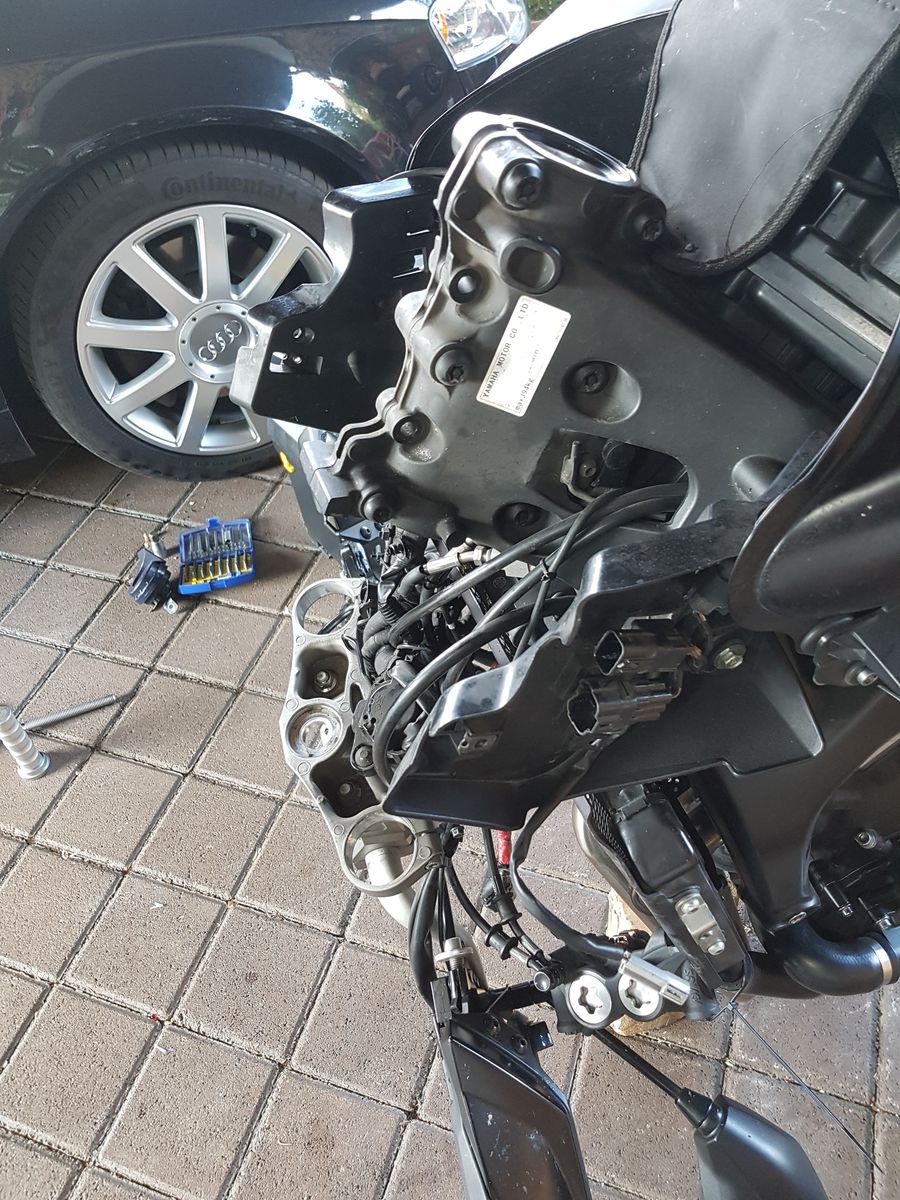 Zuerst wie gewohnt, das ganze Plastikgeraffel abschrauben. Tacho, Lampenmaske alles muss weg, bis nur noch der Lenker mit oberer Lenkkopfbrücke da ist.