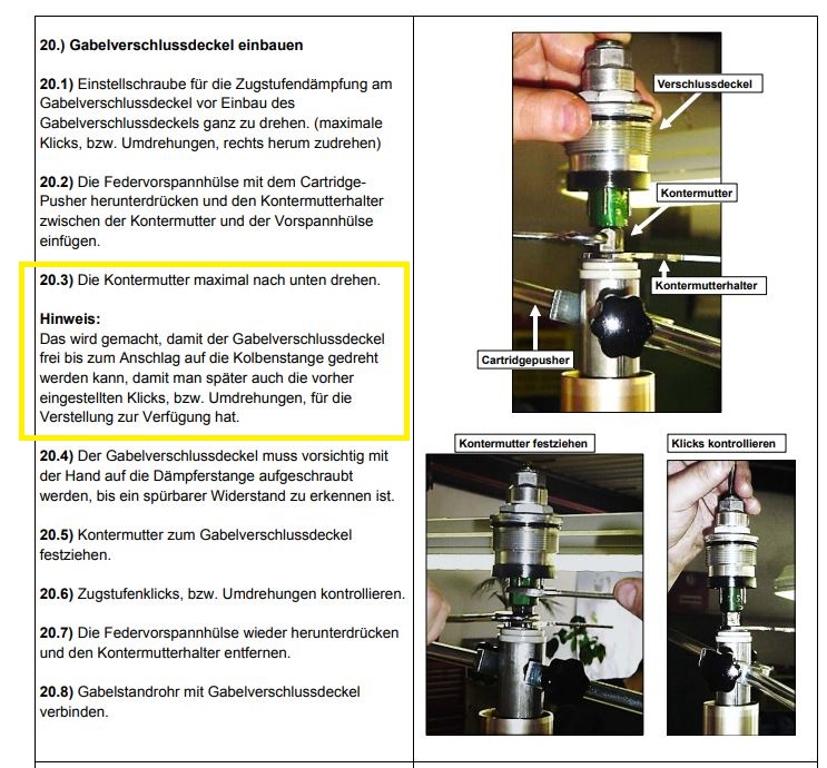 steht, man solle beim Einbau des Gabelverschlußdeckels, die Kontermutter der Kolbenstange soweit runter drehen, das die Kolbenstange bis zum Anschlag, in den Gabelverschlußdeckel eingeschraubt werden kann.