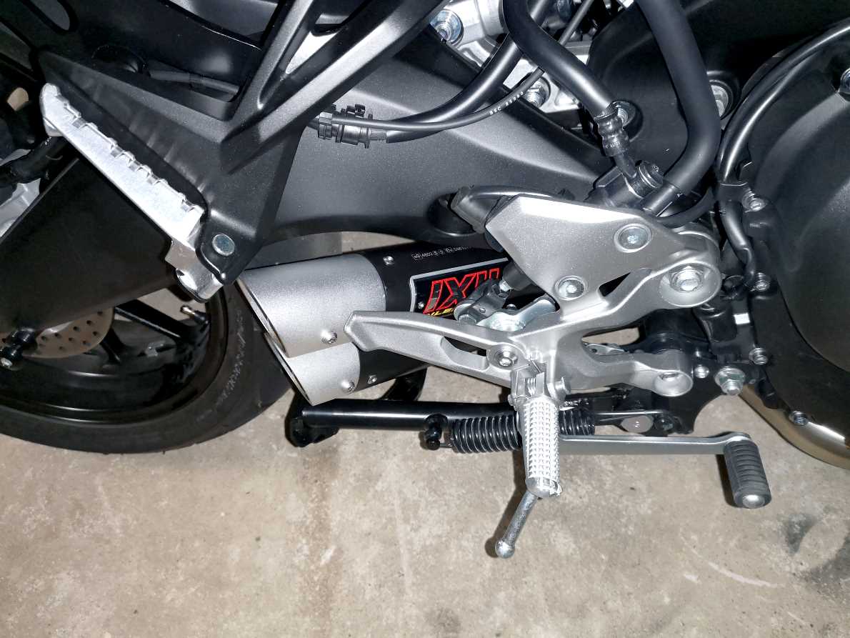 Hier noch mal ein Bild parallel am Bike runter. Da sieht man dass die Endstücke nicht zu weit raus stehen. Die Fußrasten stehen wesentlich weiter vor. -