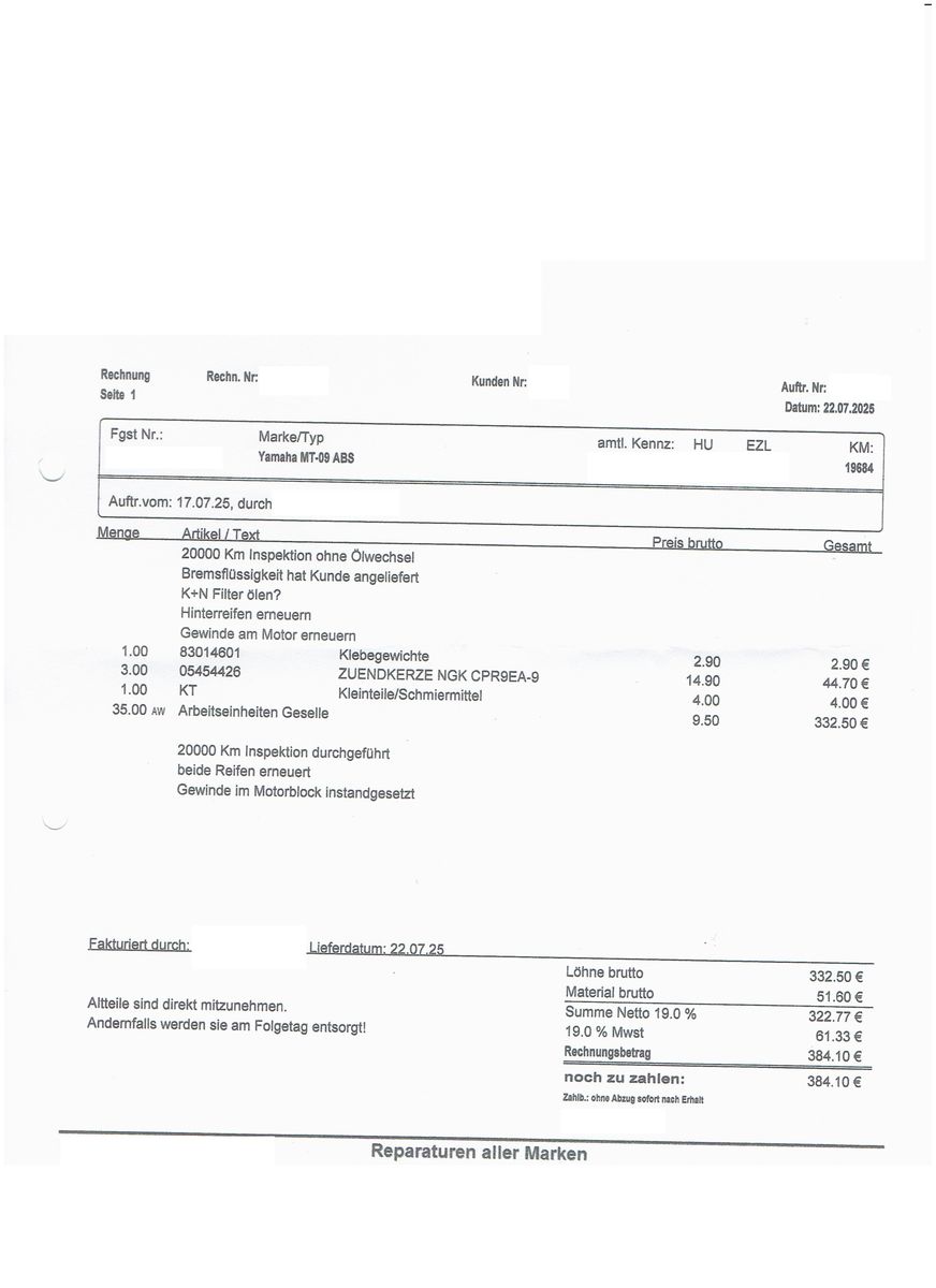 Insofern bleibt es bei 384,10 € für die 20.00er Inspektion ohne Ölwechsel und ohne Bremsflüssigkeitswechsel.