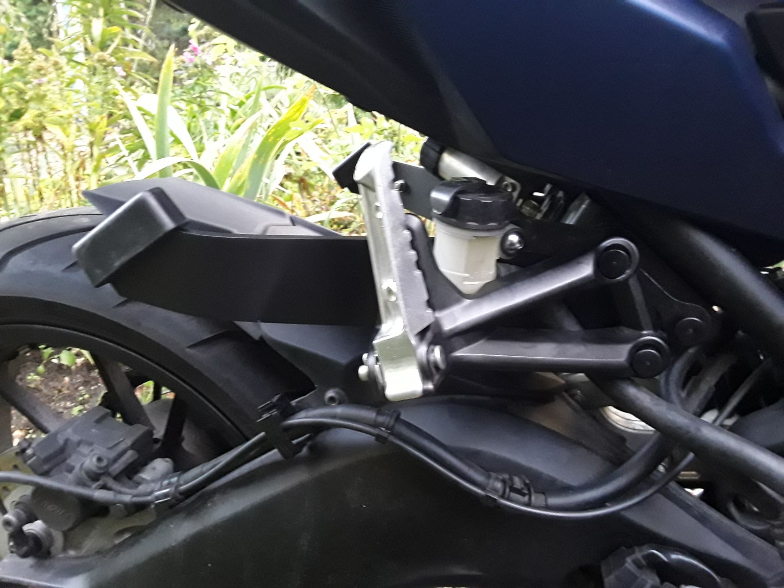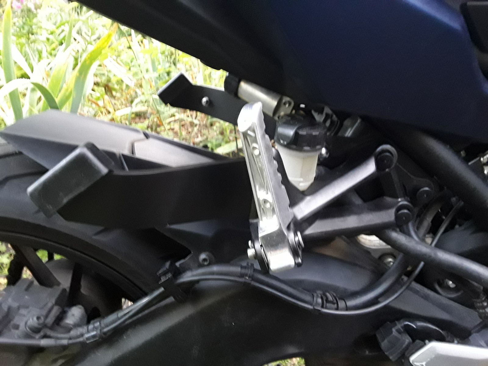 Halter sind gebogen und passen. Beim Biegen muss man sich zeit nehmen und etwas öfter montieren und schauen. Ich würde jedem eine Pappschablone empfehlen um die Biegestellen besser zu bestimmen. Die 5 mm Reserve muss aber abgezogen werden, die waren zu viel. Aber besser ab als ran. Den Halter für den Bremsflüssigkeitbehälter habe ich jetzt von vorn auf die Platte gesetzt, dass passt dann mm genau. Etwas biegen und anpassen vorrausgesetzt. Die Federvorspannung sitzt auch an der orginal Befestigung, nachbiegen und die Patrone von der anderen Seite anschrauben war die Lösung.