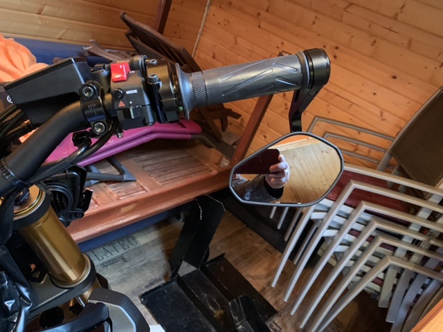 Mit den Lenkerendenspiegel nach unten gedreht hat Mann freie sich nach hinten, man muß aber dazu seinen Kopf etwas bewegen, man hat sich aber sehr schnell daran gewöhnt.