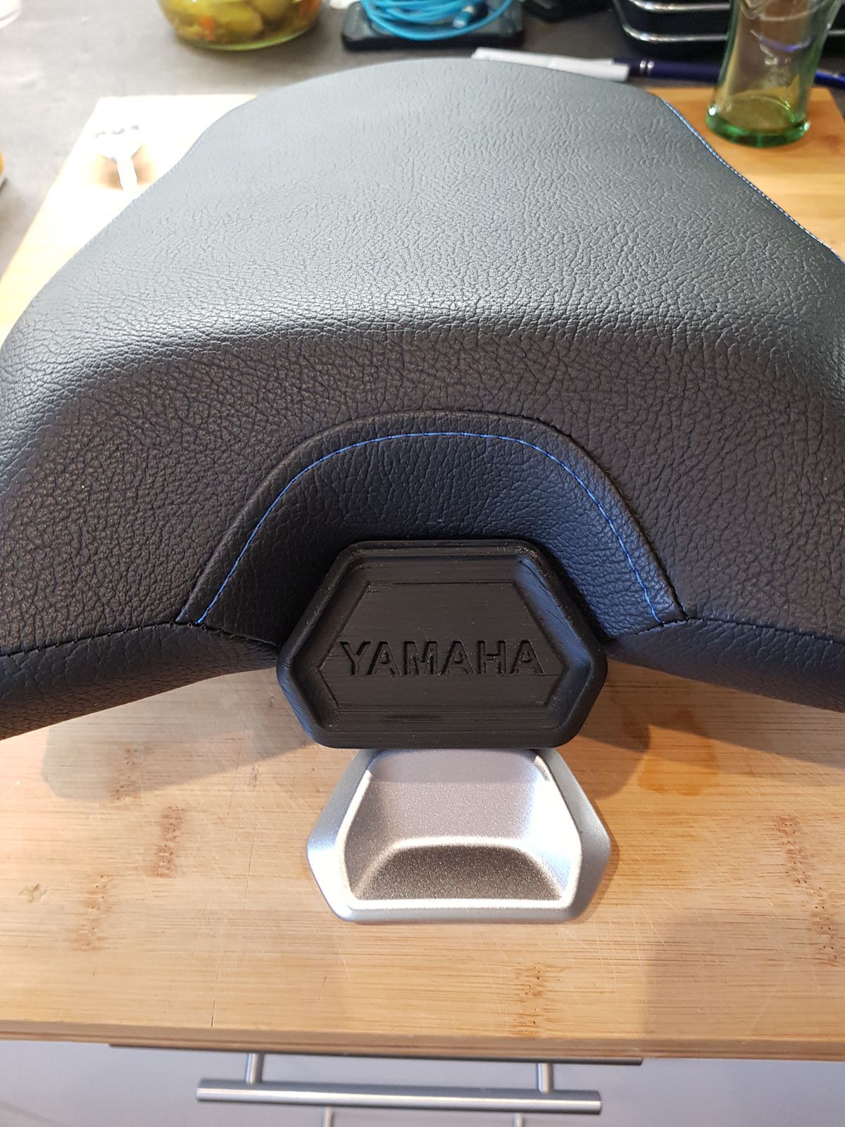 Das Bauteil ist an der Original Befestigung vom Sozius mit 2 Schrauben befestigt. Ich habe das NEUE Bauteil genau so konstruiert, wie das Original, jedoch mit einem anderem Design, damit Yamaha mir keine Urheberrechtsverletzung oder Design Kopie vorwerfen kann. Beim Schriftzug ist das auch nicht der gleiche schrift stiel.