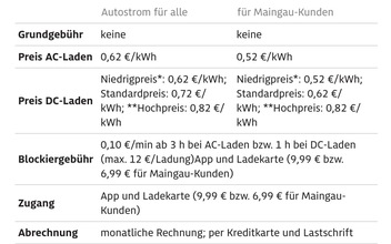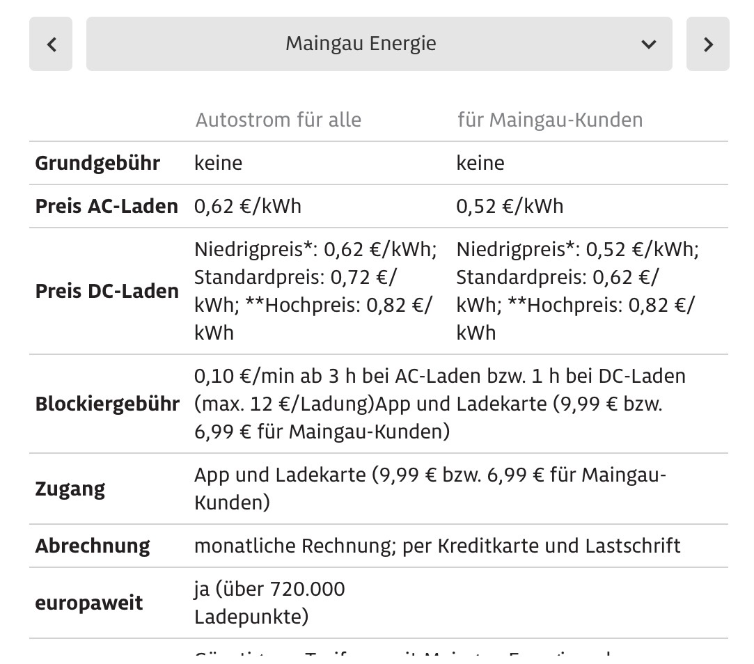 | Maingau mit „Kunden“-Karte | 0,52 | 0,52 - 0,82 | 0,52 - 0,82 | 100% zuverlässiges laden (bisher), wer kein Kunde ist legt 0,10 Cent/ kWh drauf |