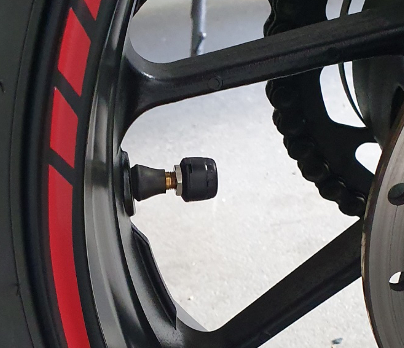 Das ist das Ventil, mit dem RreifenDruckKontrollSystem. Das baut zwar deutlich voluminöser als ein normales gerades Ventil, sieht aber nicht aus als würde es in einem abgewinkelten Ventil eingebaut an die Felge stoßen.