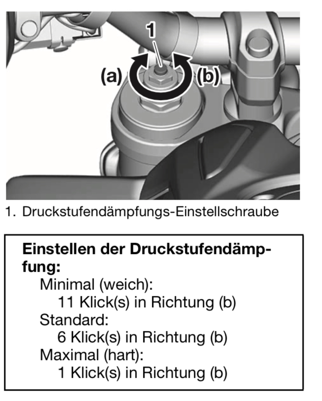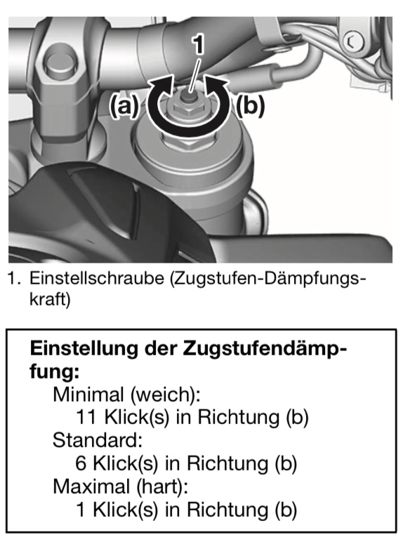 Wer jetzt bissi mehr Komfort reinregeln will könnte vorn am linken Holm (Druckstufe) 8 Klicks öffnen testen (von geschlossen aus gezählt).