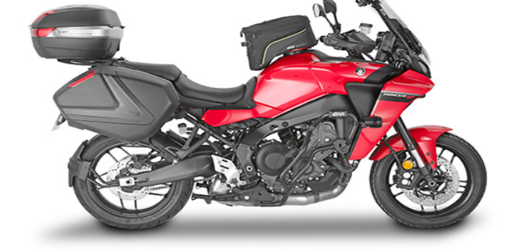 Ich fahre eine Tracer 900 GT RN 57 mit zwei Koffern , Tankrucksack und zwei kleinen Taschen an den Sturzbügeln .