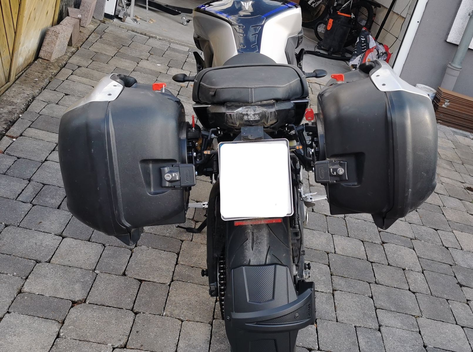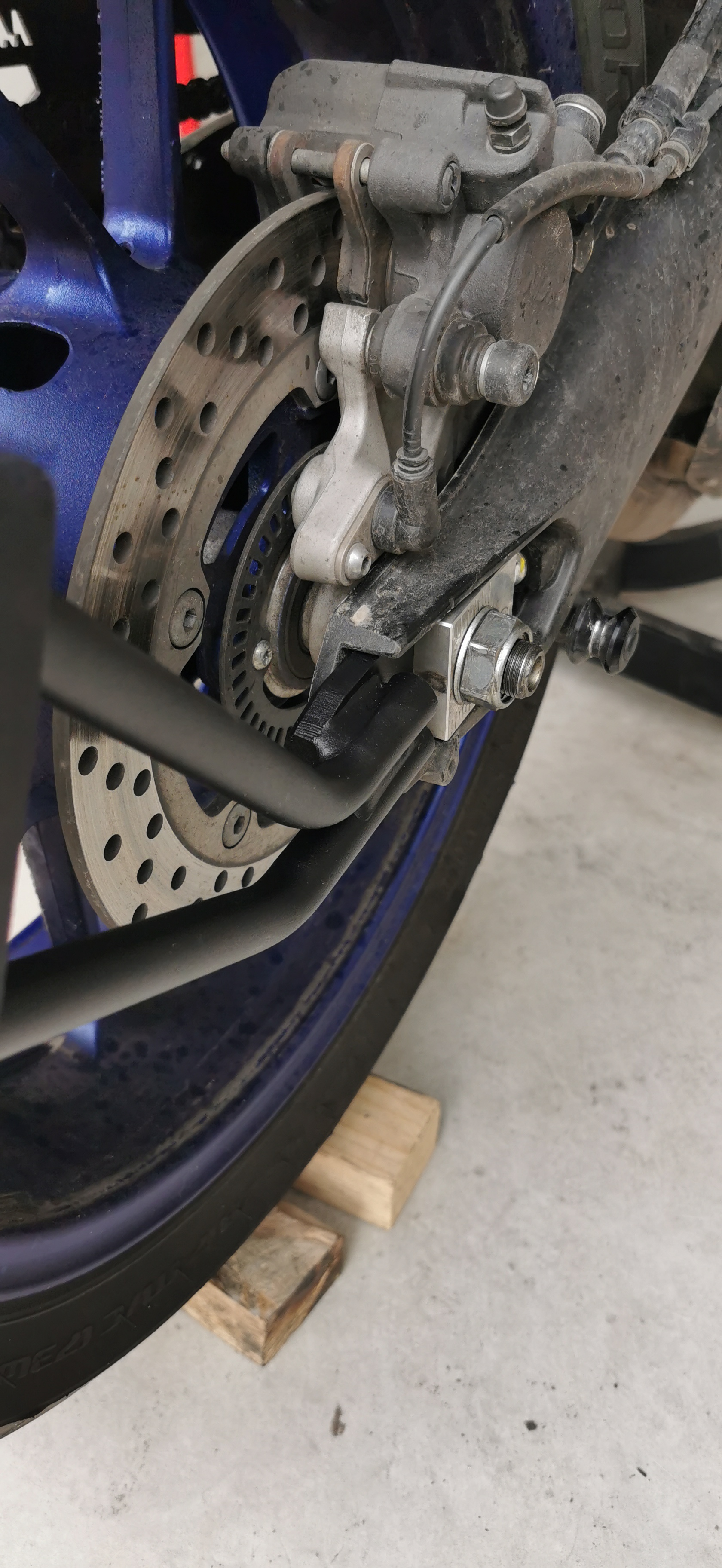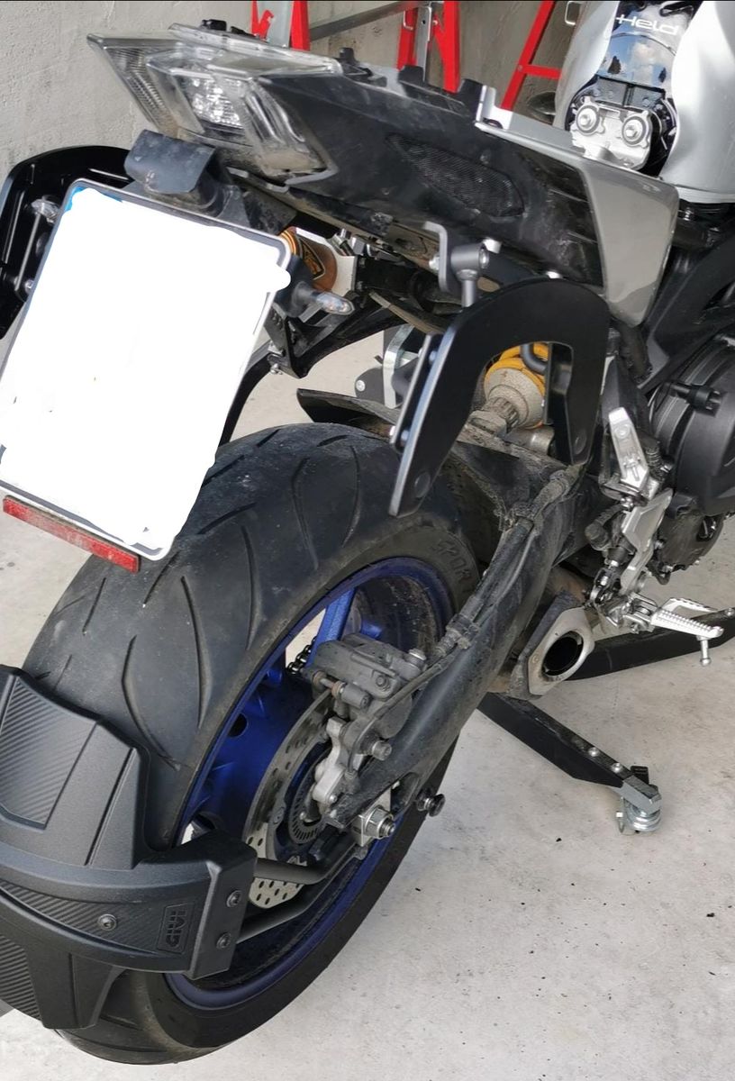 Nimmt man nun den Givi Halter, muss die Achse umgedreht werden und da auf der "Festseite" der dünne Ketten-Spanner mit der Erhöhung (zum Fixieren der Achse) rein muss, fehlt nun auf der Gegenseite der dicke Ersatz-Spanner (zwecks langer Achse)!