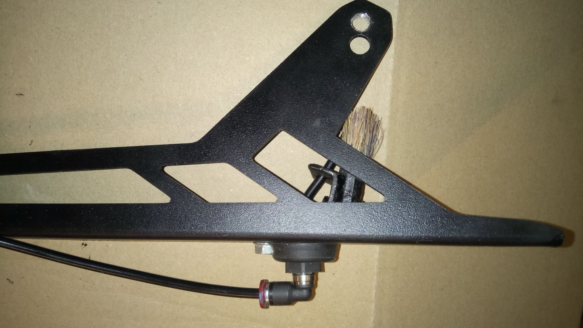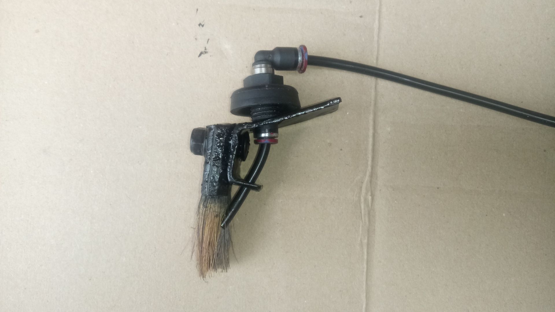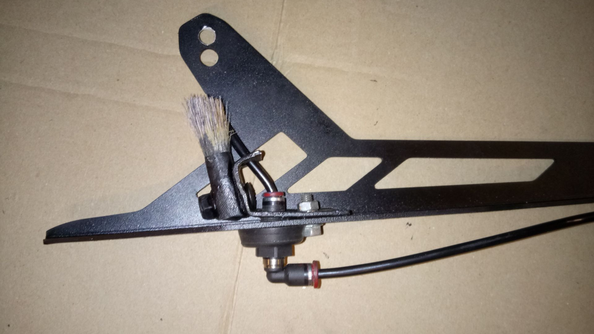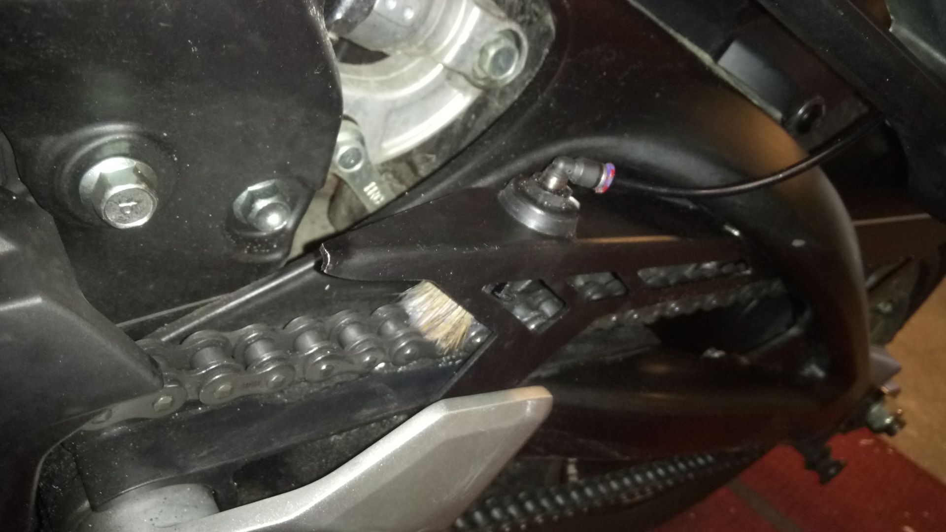 Habe mir jetzt noch einen neuen Kettenschutz angebaut. Da ich dazu sowieso das Ventil umbauen musste, konnte ich auch gleich noch eine andere Idee umsetzen. Damit das Öl schön gleichmäßig auf die Kette kommt und gleichzeitig die Kette gereinigt wird, habe ich einen Pinsel vor den Schlauch gesetzt.