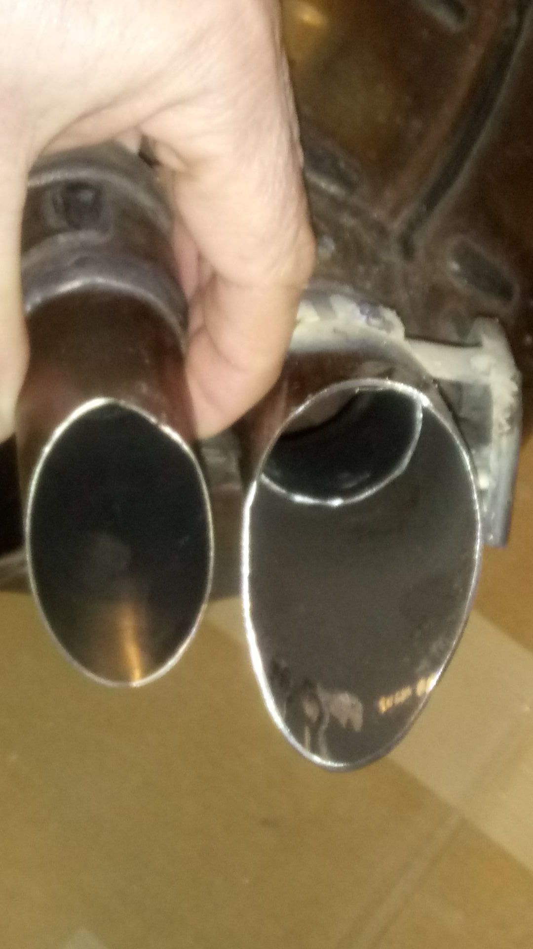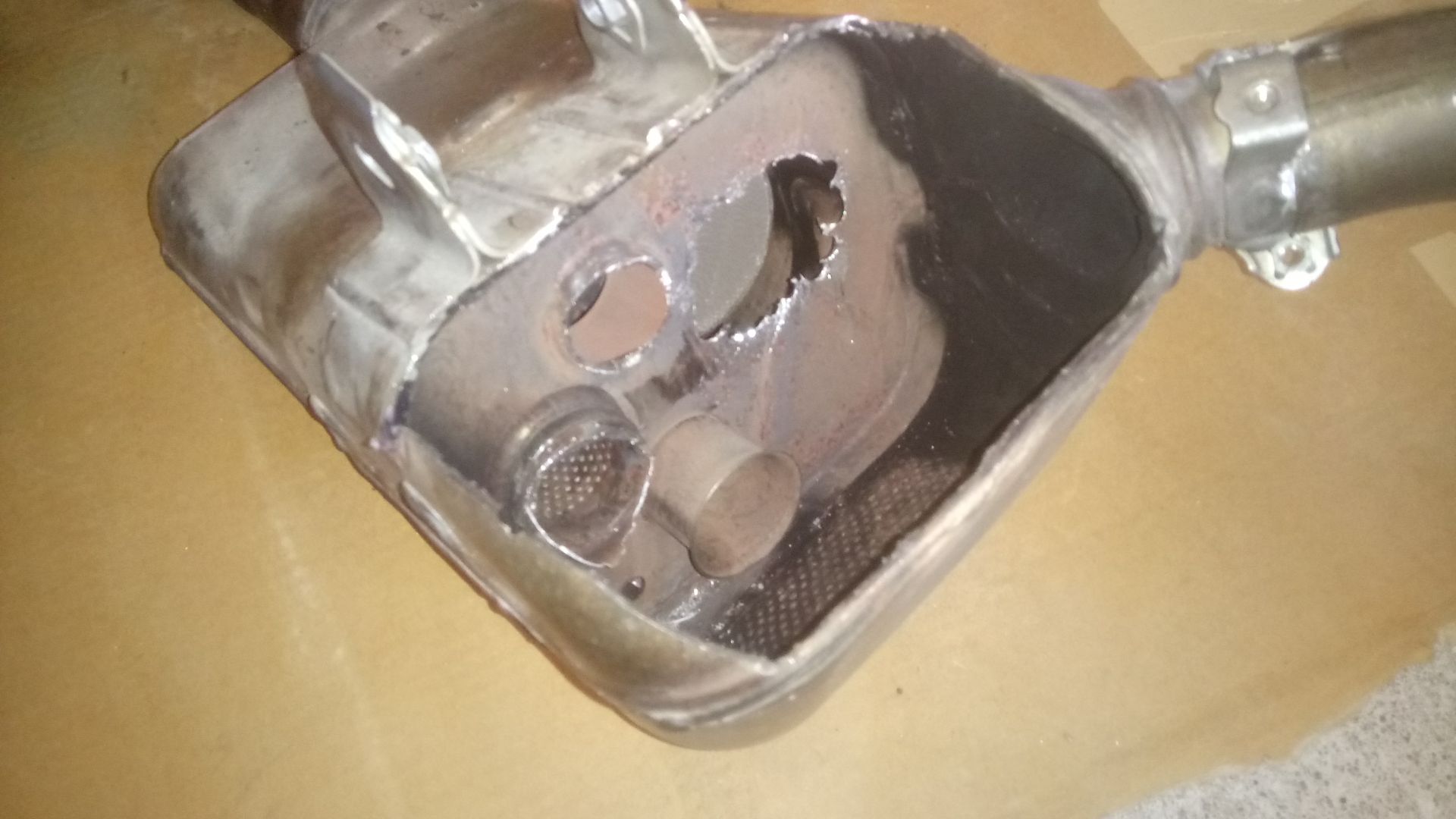 So, nun Bilder von der Rohbauphase. Das Rohr, das zum Auslass führt, komplett entfernt und das Auslassrohr durch ein etwas größeres (4,5cm statt 3,5cm) ersetzt. Dieses soweit angepasst, dass die Blende der Tracer wieder passt. Dann sollte es kaum noch auffallen. Nachdem ich ihn vom Schweißen zurück habe, sende ich mehr.