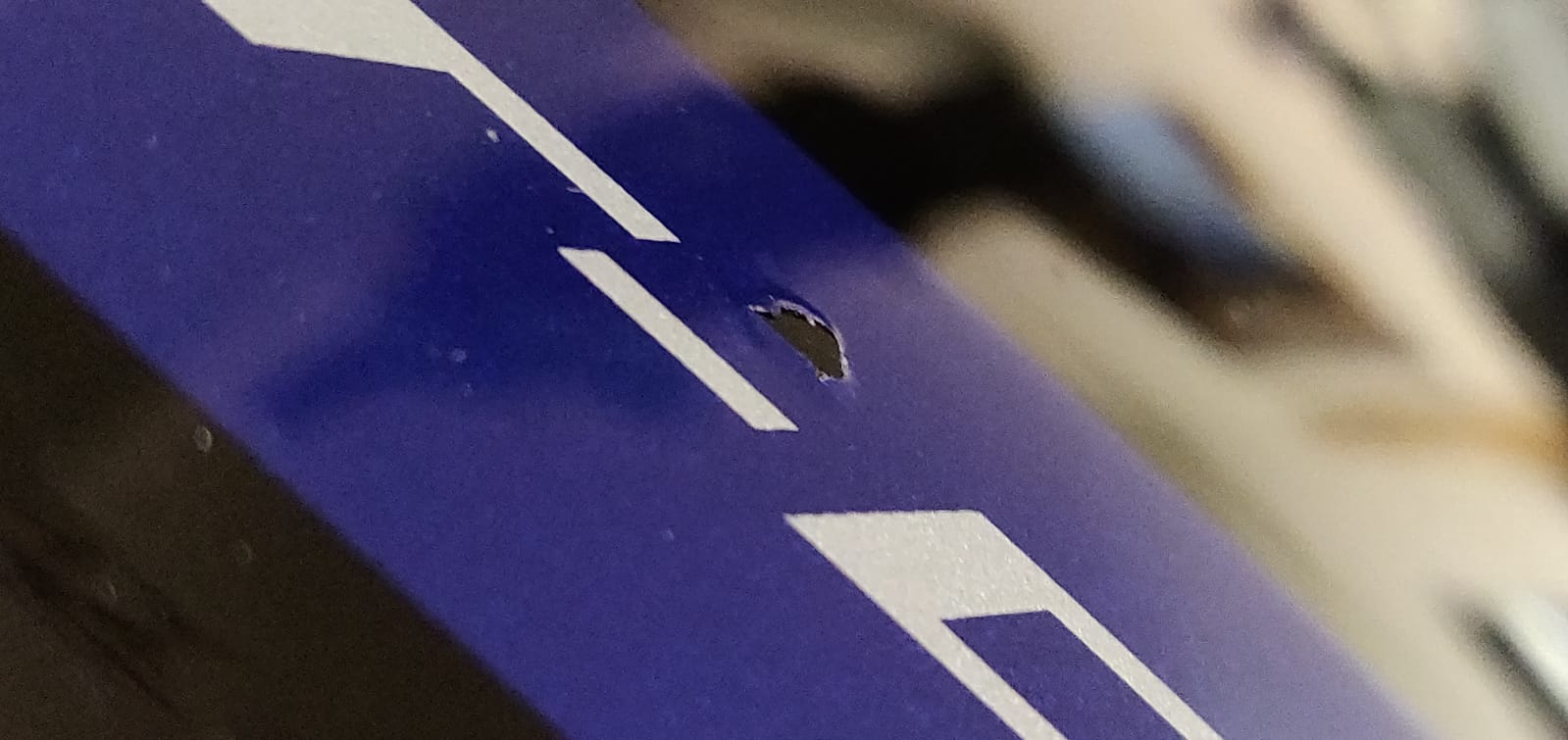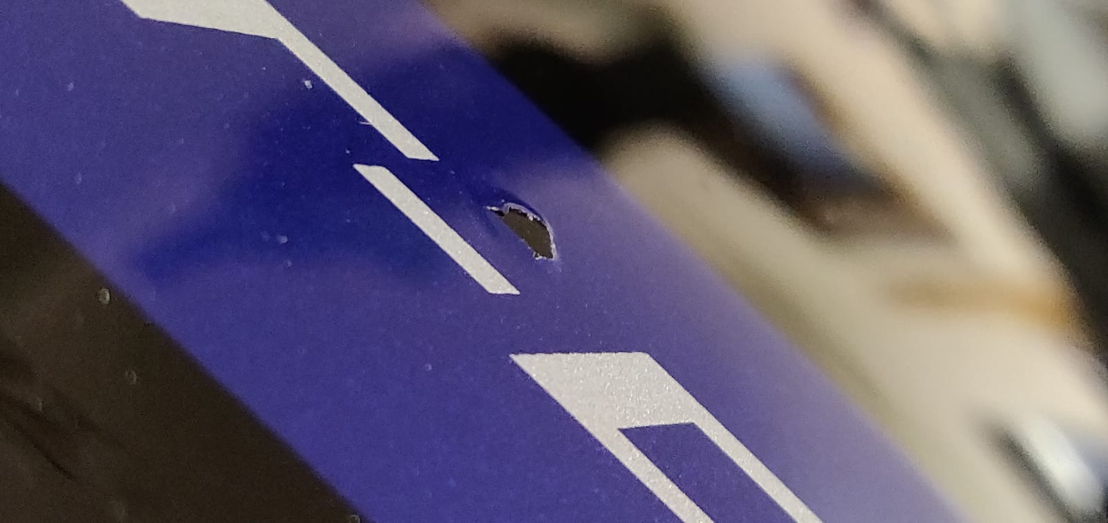 Vor ein paar Tagen ist mir während der Fahrt ein schwarzer Fleck auf dem blauen Streifen am Tank aufgefallen und ich hielt ihn vorerst für Dreck. Doch nach genauerem Betrachten stellte sich das als Lack-Abplatzer heraus. Es fehlt der Klarlack + blaue Lack. Zusehen ist nurmehr der schwarze Lack vom Tank. Dieser Abplatzer ist in etwas 10mm x 10mm groß und rundherum hat sich der Lack etwas aufgewölbt. Sieht fast aus als wäre eine Folie aufgeplatzt. Auf jeden Fall nicht wie ein Steinschlag. Auch die Position passt nicht zu einem Steinschlag, denn sonst hätte dieser Stein zuerst gegen mein Visier und dann auf den Tank fliegen müssen.