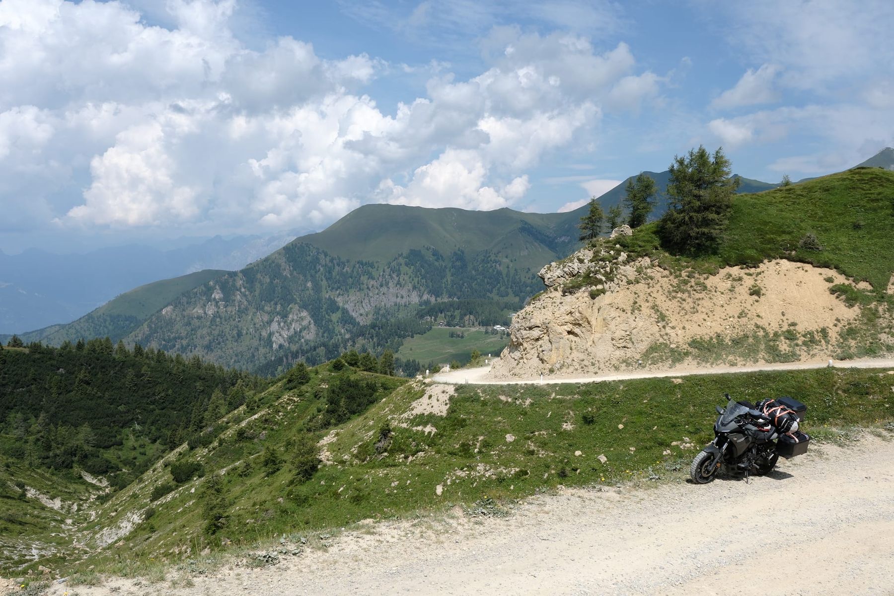 Giogo del Maniva. Ab hier sollte es Offroad in Richtung Passo del Dosso Alto, Passo della Spina und Passo del Mare nach Idro gehen. Der Plan wurde vereitelt durch eine grobe Baustelle mit entsprechender Absperrung. Die erste Absperrung ist an sich kein Problem gewesen. Aber die zwei Absperrung ist fuer die Tracer nix gewesen.