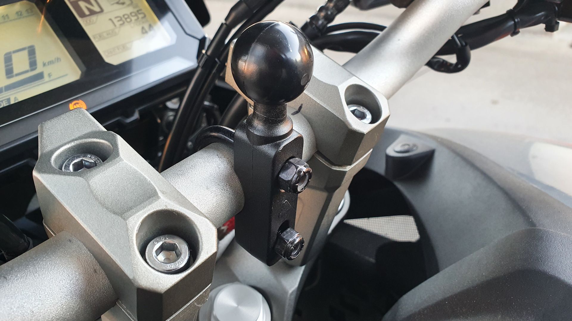 Wenn auch Hochformat möglich ist, vielleicht doch am Lenker montieren, aber weiter außen, damit es neben dem Tacho steht? Lässt sich dann evtl. auch bequemer während der Fahrt bedinen. Außen am Lenker passt die Klemme auch.