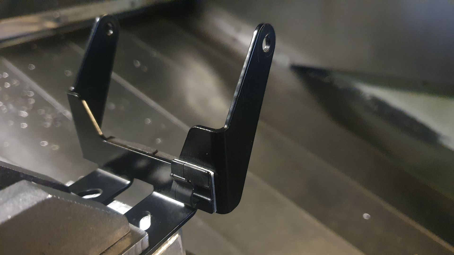Um 180 Grad umdrehen wäre die Lösung, geht aber auch nicht, weil da die beiden Schrägen des Blechbügels im Weg sind, die stoßen dann innen an die Konsole für die Höhenverstellung der Scheibe.