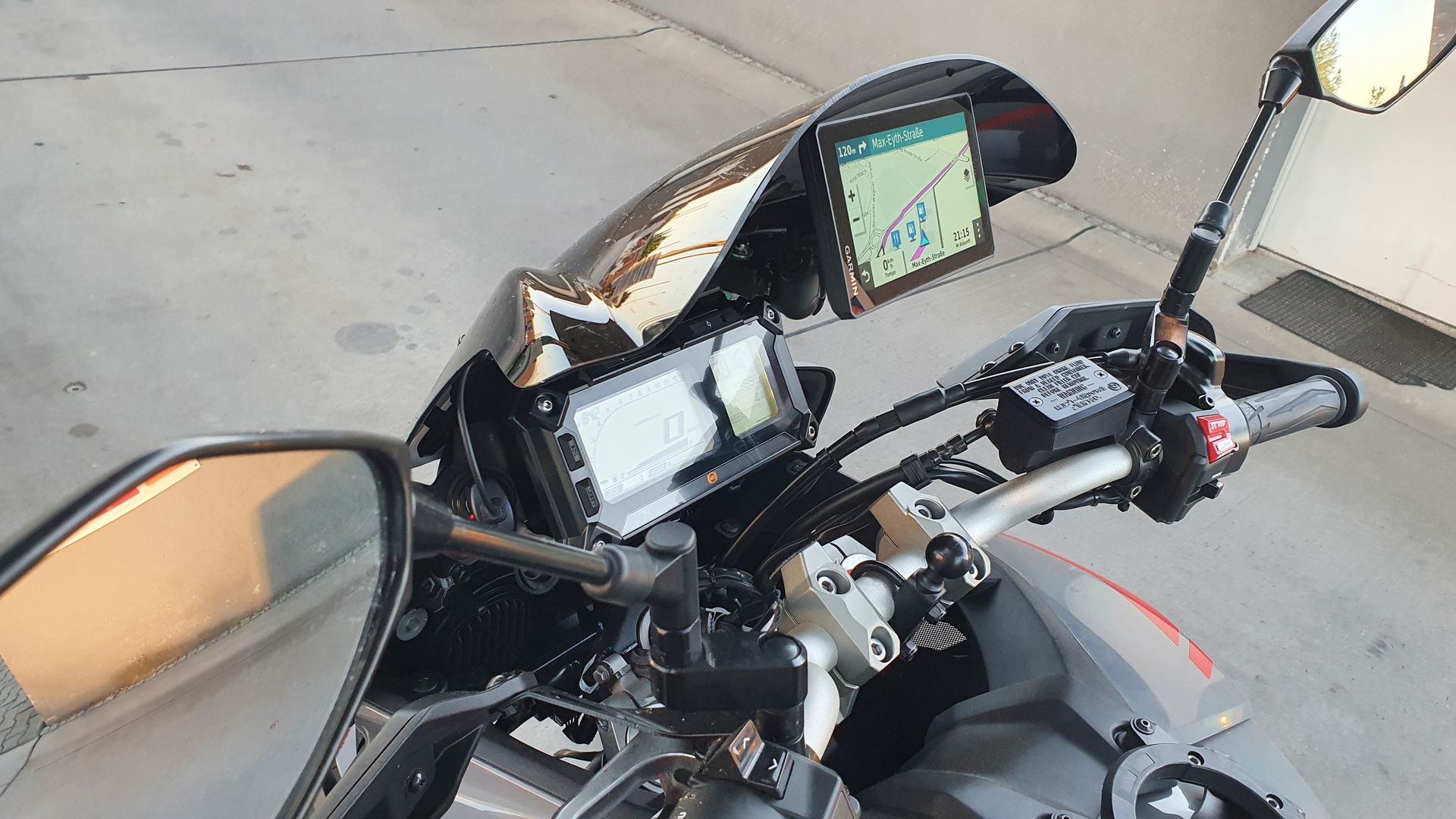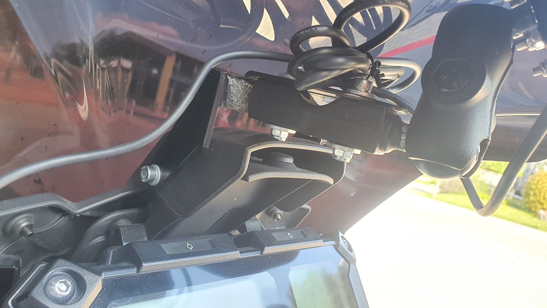 Alles anzeigenSo sieht es aus:Ermax Sportscheibe, Navi Halterung oberhalb der Amaturen mit RAM Kugel, Festanschluß an einem Nebenverbraucherstecker, Garmin Zumo mit Halterung.
