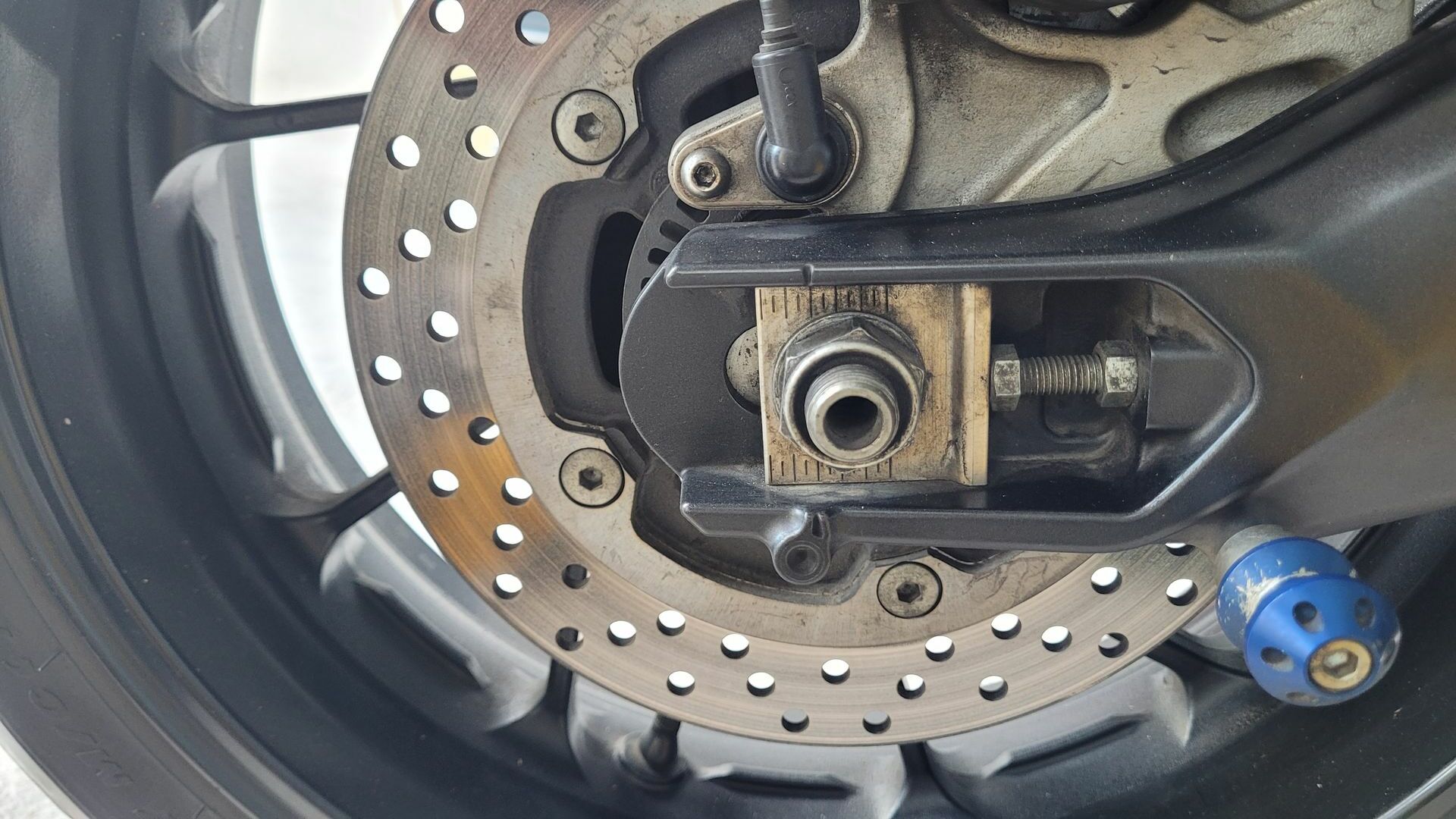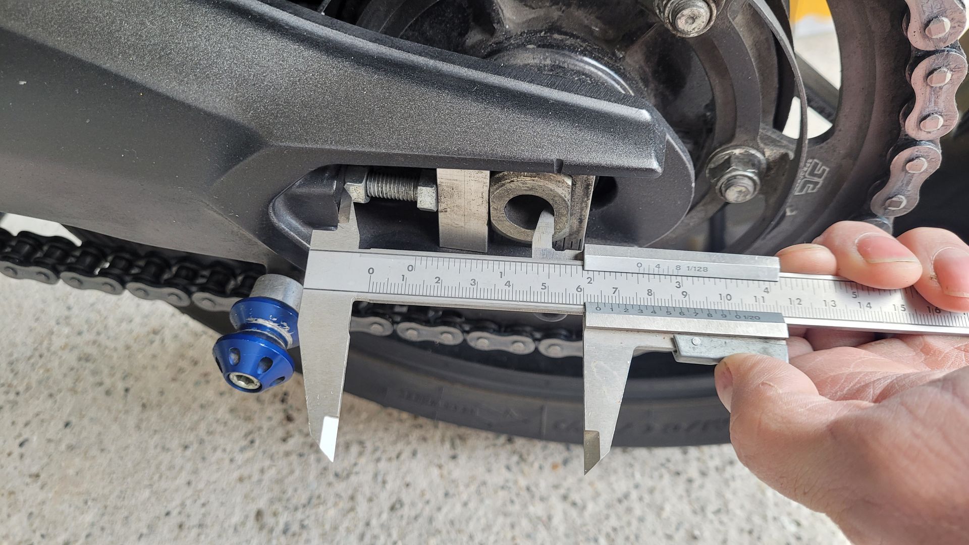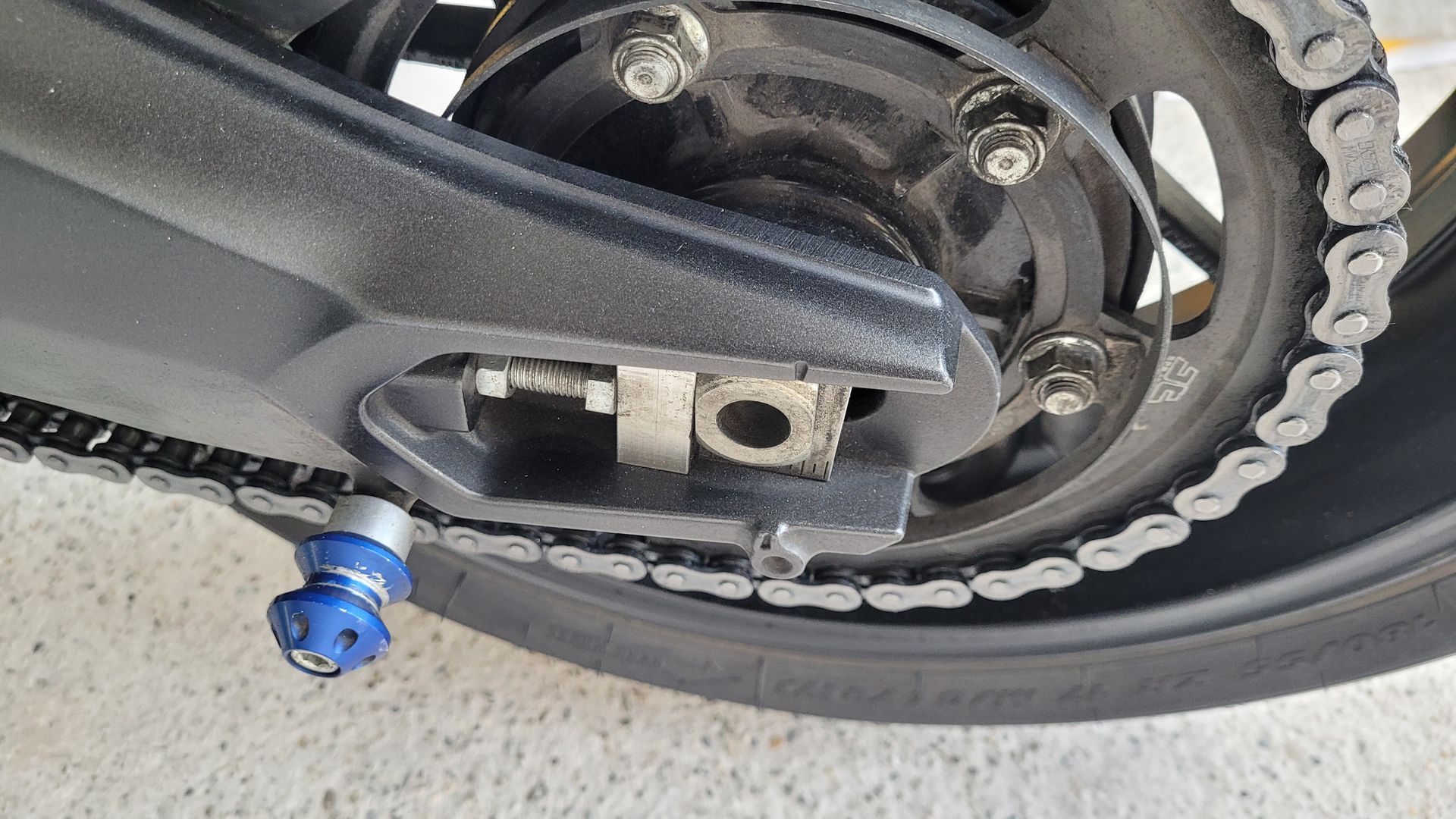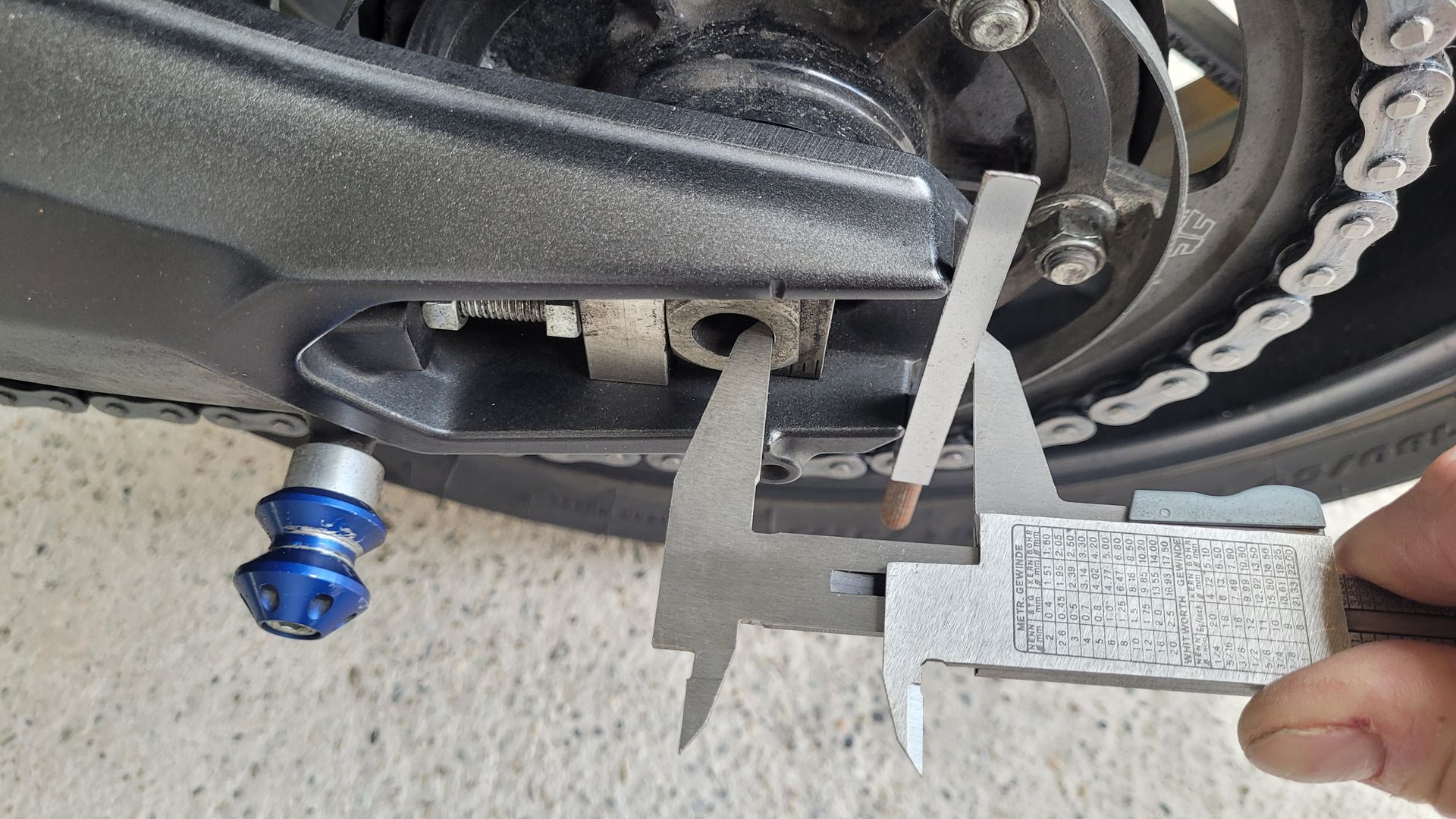 Fängt schon damit an, daß die Markierungen, die an der Schwinge sind, ca. einen Zentimeter weit entfernt sind von den Markierungen am Kettenspanner, siehe Bild:
