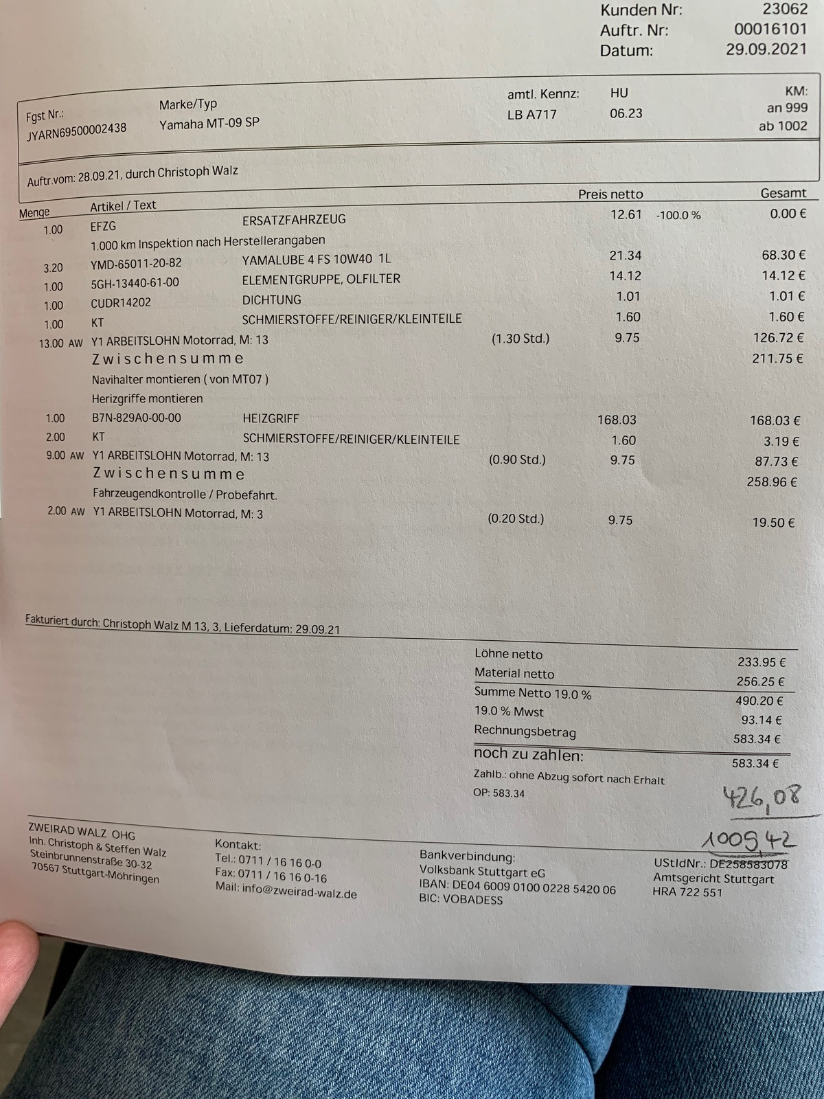 Alles anzeigenja, der in Hanau soll auch nicht das gelbe vom Ei sein. Bin öfters bei meiner Freundin in Würzburg. Eventuell geh ich zum hmf Motorräder. Der war eigentlich recht kompetent. Habe dort ja meine Probefahrt mit der Mt09 absolviert. Wann machst du den 1000er? Evt. kannst du ja dann Feedback geben wie er war und was er verlangt hat. Wäre echt hilfreich.