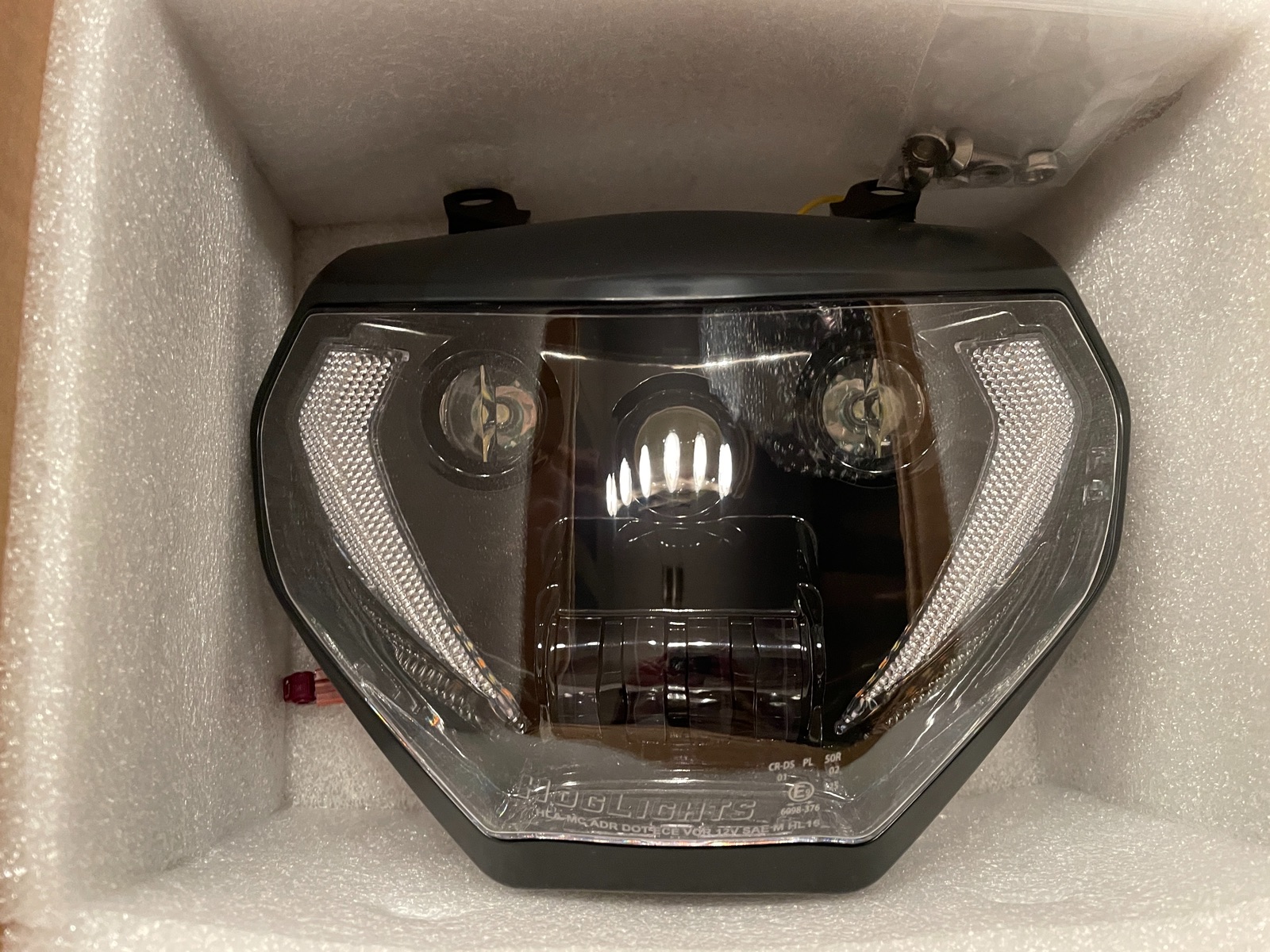 Ich habe durchaus vor dem Kauf des hier verbauten LED-Scheinwerfers an mehreren Stellen nachgefragt, ob dieser nun erlaubt ist oder nicht. Ich habe vorne weg auch schon gesehen, dass mehrere Anbieter optisch denselben Scheinwerfer anbieten (Retrofitlab, Hoglights etc). Das Strassenverkehrsamt Zürich ist allerdings nicht weiter auf den Scheinwerfer respektive den Hersteller eingegangen, sondern verwiesen wie üblich auf das Prüfzeichen etc. Meinen Scheinwerfer habe ich von Hoglights.com.au bestellt, welcher auf Anfrage bestätigte, dass die Scheinwerfer über ein E-Prüfzeichen verfügen und auch nach dessen Abklärungen in der EU und in der Schweiz legal einsetzbar seien. Auf meinem Scheinwerfer sind auch sämtliche Prüfzeichen ersichtlich im Gegensatz zu den Versionen von Retrofitlab, welche meine Freunde gekauft haben und gar nichts ersichtlich war. Unterschiede sind zwischen diesen Versionen scheinbar nur das Tagfahrlicht, welches bei meinem nicht integriert ist und demnach Stand- bzw. Positionslicht und Abblendlicht leuchtet bei eingeschaltetem Motor. Auch darf, obwohl die Blinkfunktion zwar integriert gegeben wäre, diese nicht angehängt werden (sind zwei zusätzliche Kabel angeschrieben mit links und rechts).