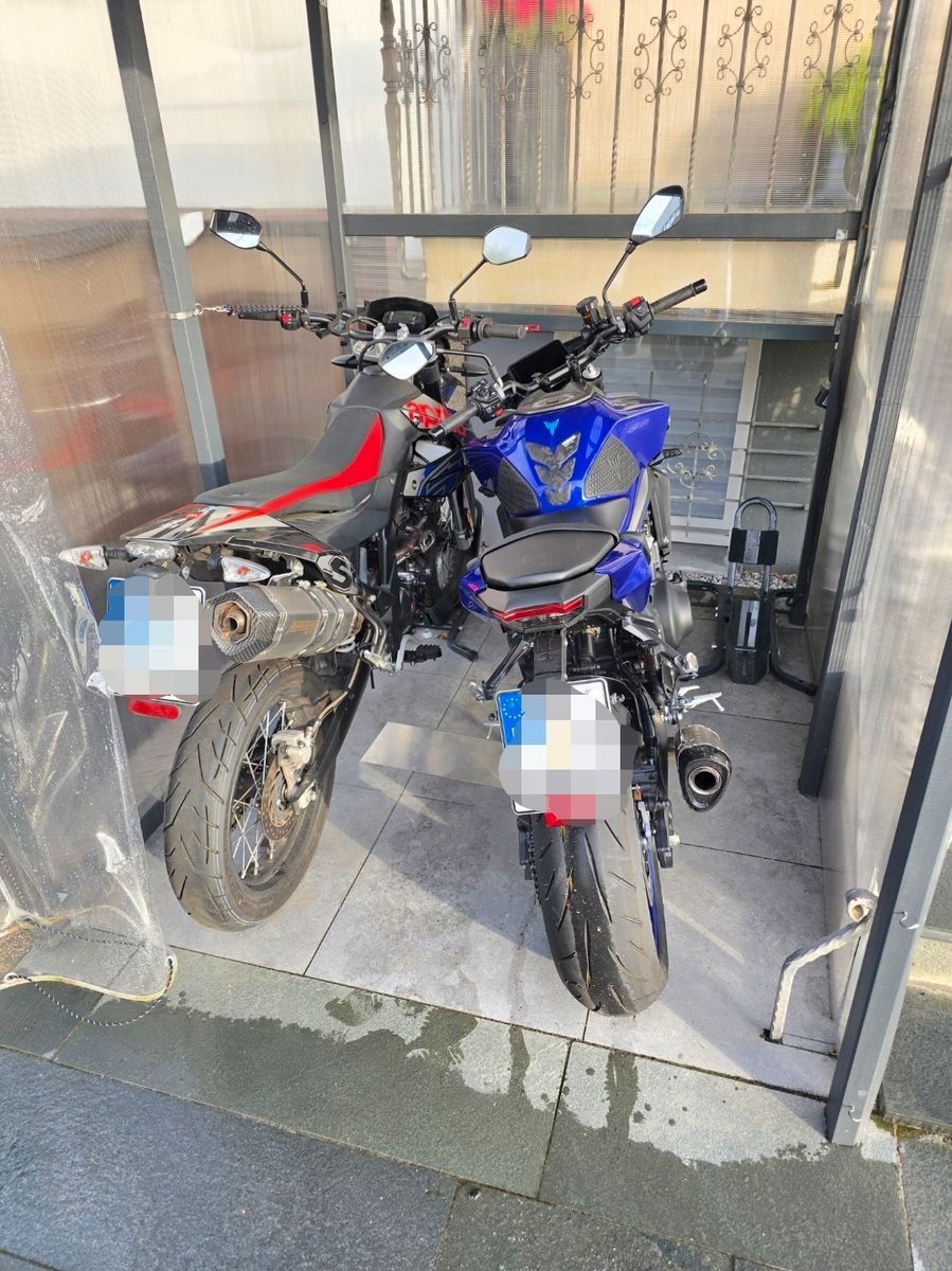 Super ist, dass es rund ums Motorrad genügend Platz zum Schrauben gibt, auch wenn es regnet im geschlossenen Zustand.