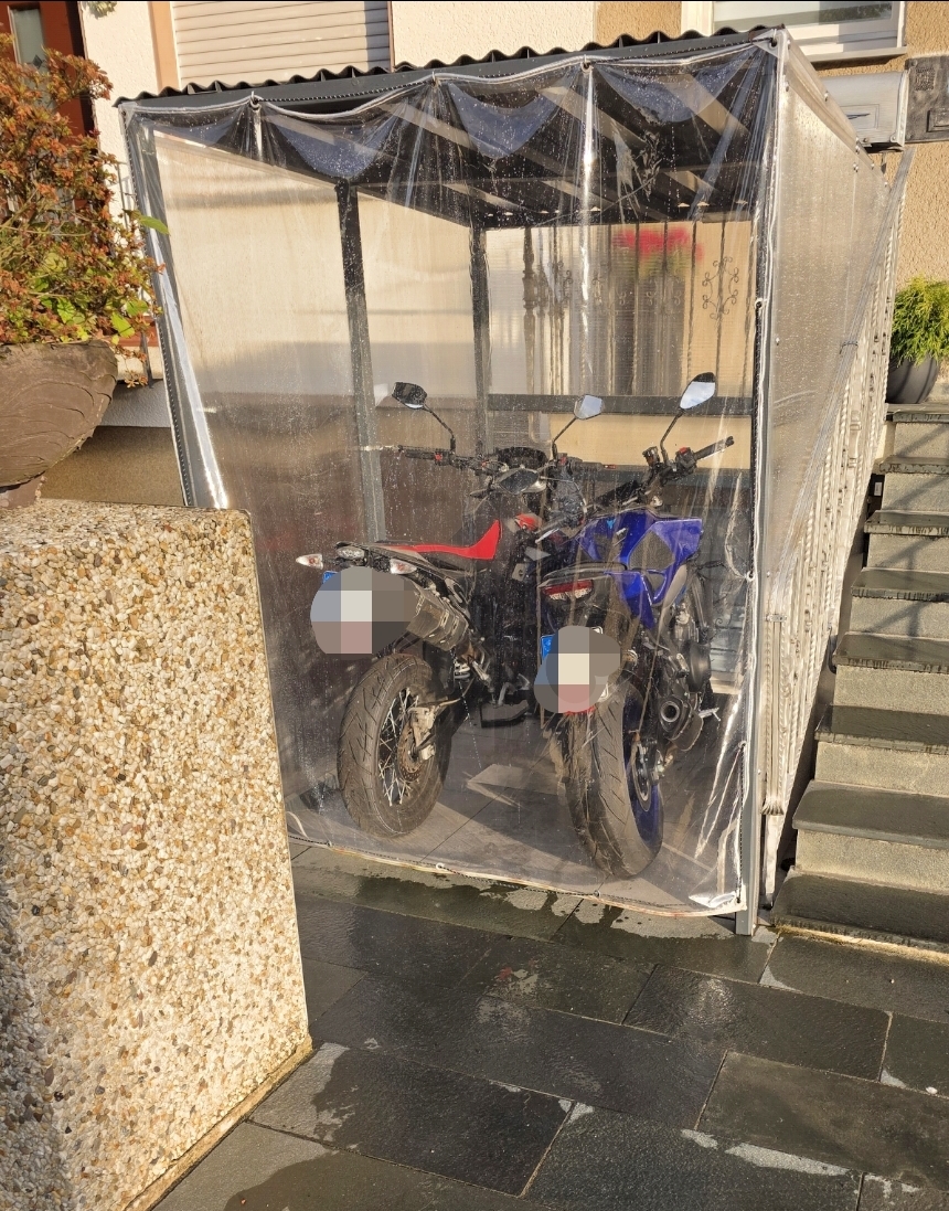 Wie ich sehe ,ist es oben an den Seiten weiterhin offen, damit Feuchtigkeit abziehen kann. Gute Idee, halte ich mir mal im Hinterkopf. Und dadurch dass es durchsichtig ist, kann man morgens ,nach dem aufstehen, ungewaschen,mit Pöttchen Kaffee seine Moppeds anschauen und von kommenden Sommer träumen