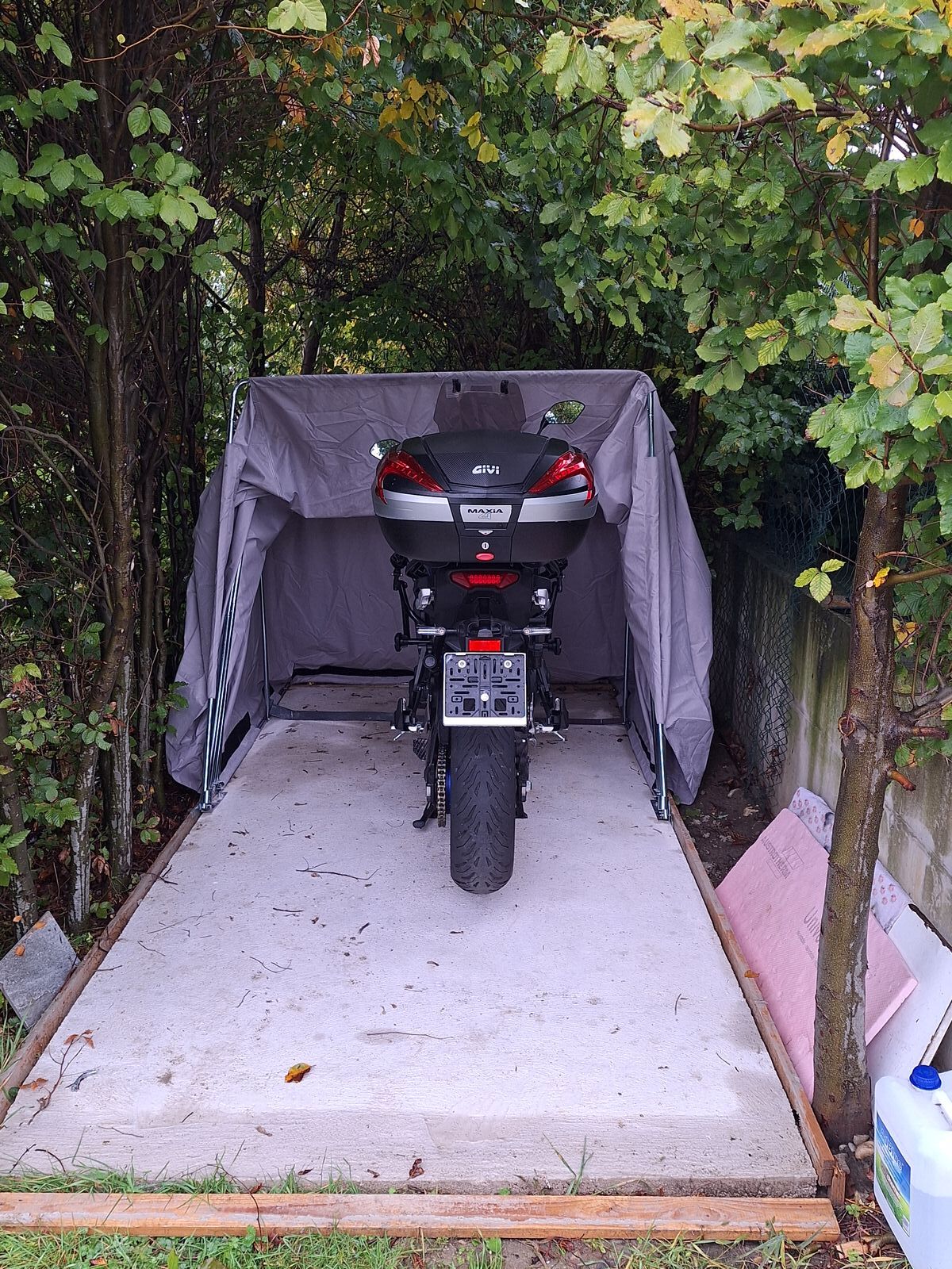 In Ermangelung einer Garage habe ich in meinem "Urwald" eine freie Fläche geschaffen und eine Faltgarage von Motea installiert.