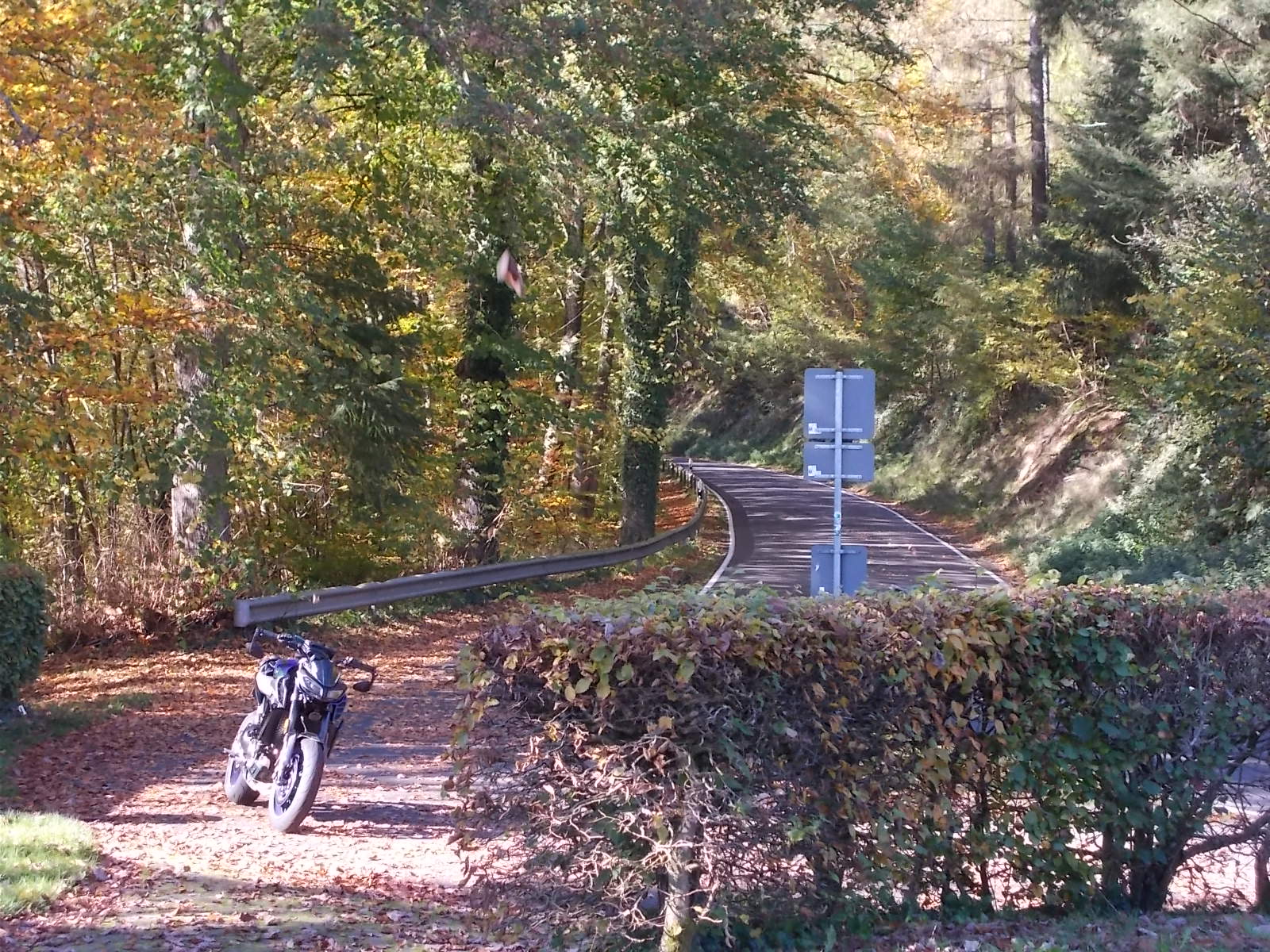 Während der "Abfahrt" zum Rursee runter (Einruhr) konnte ich schon von Weitem vor mir eine Kolonne Niederländischer Biker ausmachen....erkennbar an den grellgrünen Warnwesten, die ein jeder trug. An der Brücke in Einruhr (die mittels Ampelanlage nur noch einspurig abwechselnd befahren werden darf) bin ich dann verbotenerweise bis gaaaaanz nach vorne gefahren , denn dahinter geht es hinauf nach Vogelsang, eine meiner zahlreichen Lieblingsstrecken. Die wollte ich ohne Kriech-Verkehr vor mir genießen....hat auch geklappt.