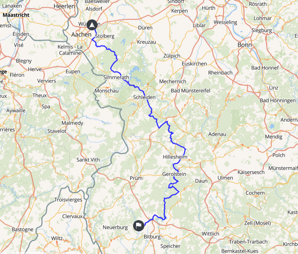 Nach dieser kleinen Stärkung gings dann wieder Richtung Heimat, natürlich auf ener anderen Strecke entlang der Deutsch-Luxemburgischen Grenze und einer Teilstrecke durch Belgien durch folgende Ortschaften: Waxweiler, Preischeid, Wehrbüsch, Lützkampen, Mützenich, Schönberg, Andler (B), Büllingen (B). Wieder in Deutschland ging es über Hammer, Dedenborn, Rurberg, Lammersdorf und Zweifall nach Hause.
