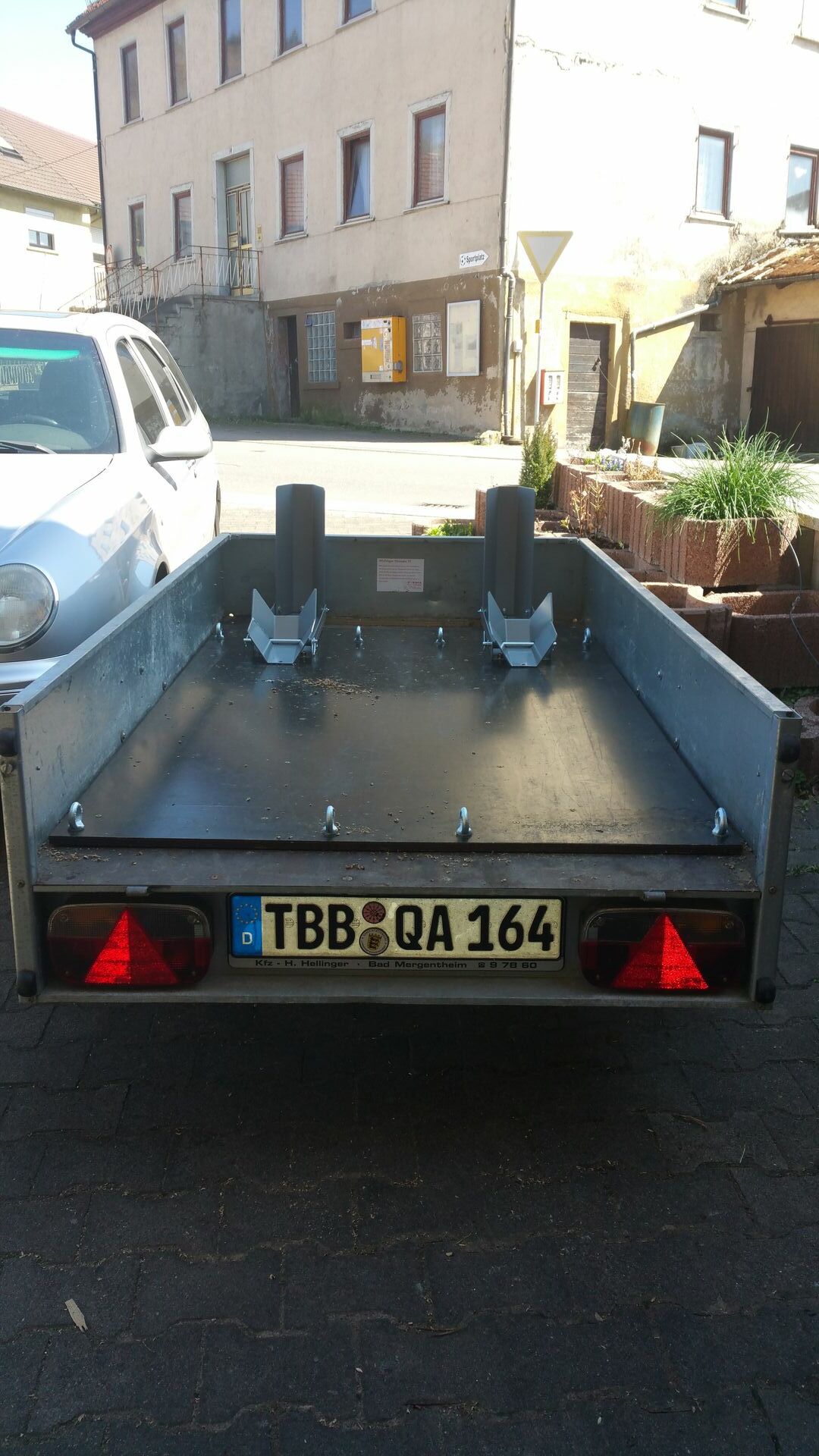 Hab das bei mir so gelöst. in der Mitte kann man eine der 2 Schienen montieren, wenn man nur ein Moped transportiert. War usprünglich auch mal ein einfacher Baumarkt Planenanhänger. Allerdings nur 1m Innenhöhenmass, zuwenig für Moped. Vorne Quer ist auf der Frontwand eine geklappte Auffahrrampe montiert, die dann hinten angelegt wird.