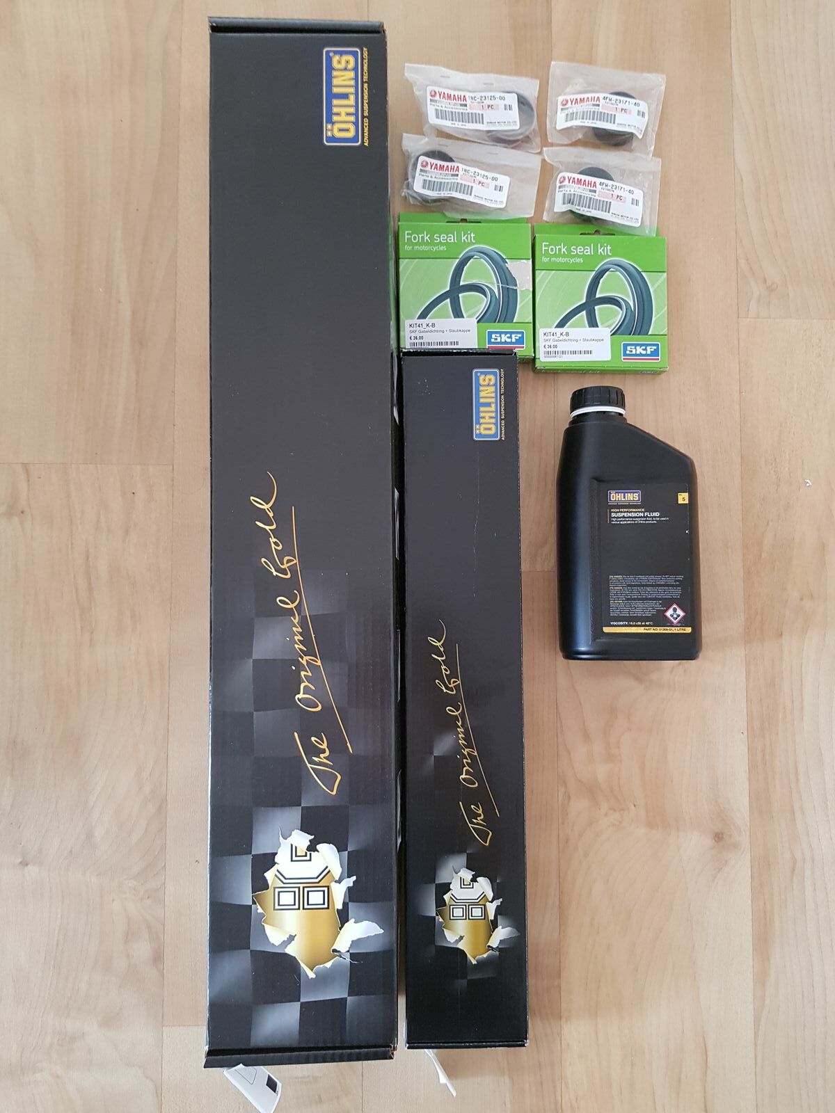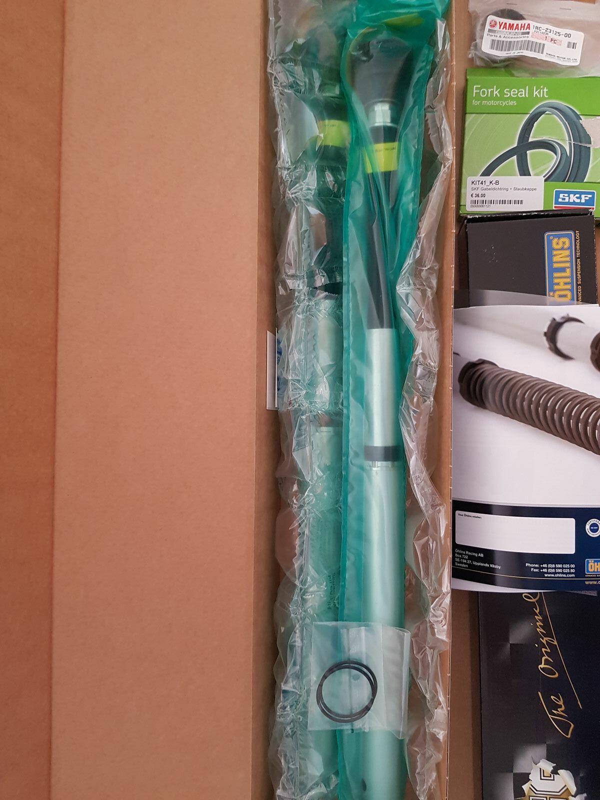 Dazu lege ich noch die Cartridge Federn dabei (Federrate 9.0 für Fahrer bis 80kg netto Gewicht ohne Schutzkleidung), 1l Gabelöl, ein Gabeldichtsatz mit FKS Simmeringen und original Yamaha Gleitbuchsen.