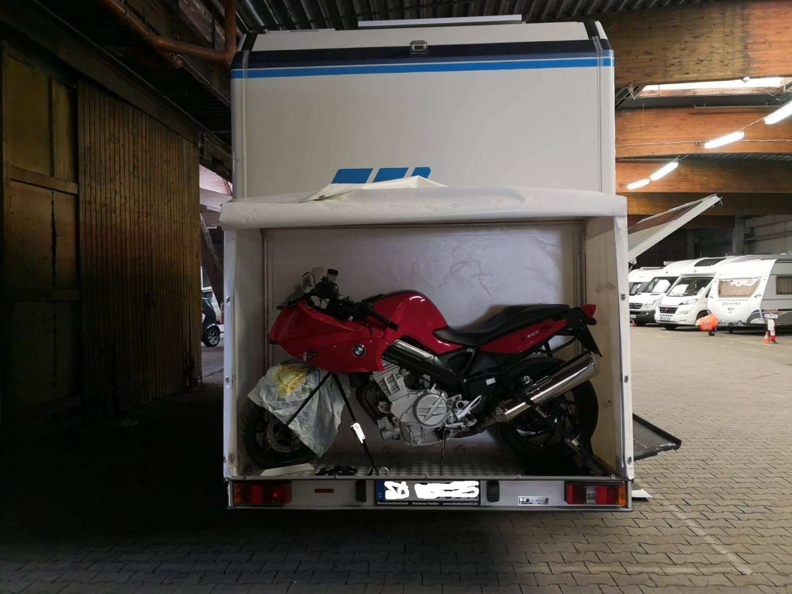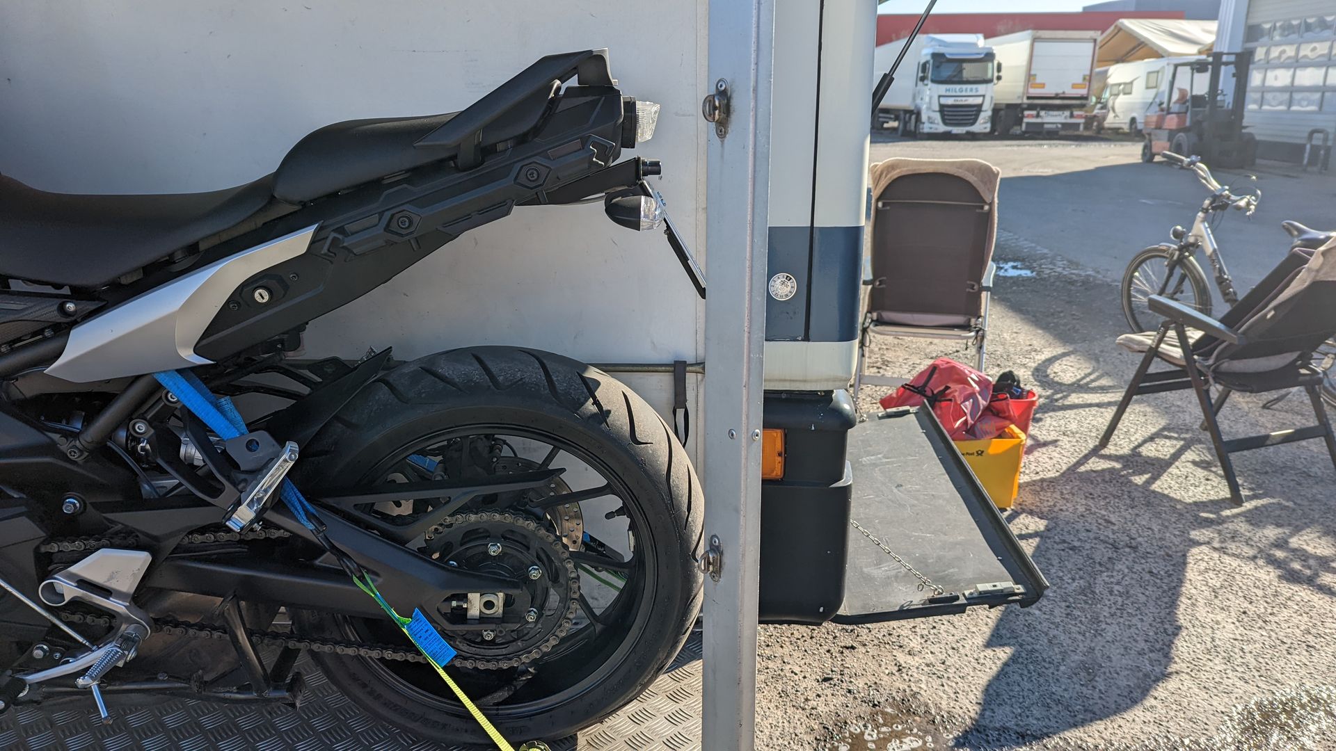 Die Achslast hinten ist kein Problem, im Gegenteil ohne das Mopped in der Kiste ist die Achslast an der Vorderachse recht ausgereizt.